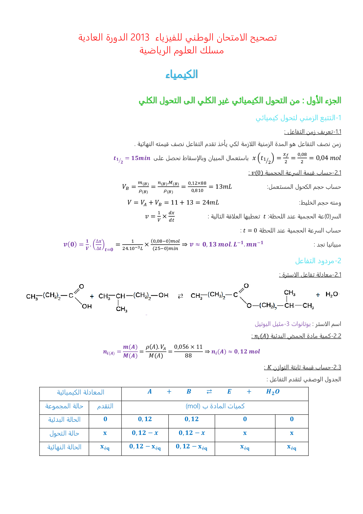 الفيزياء والكيمياء علوم رياضية 2013 الدورة العادية - التصحيح