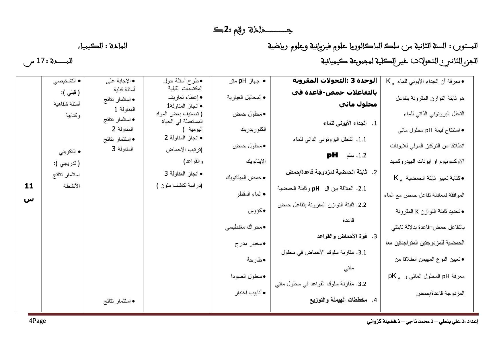 جذاذة التحولات الكيميائية المقرونة بالتفاعلات حمض قاعدة