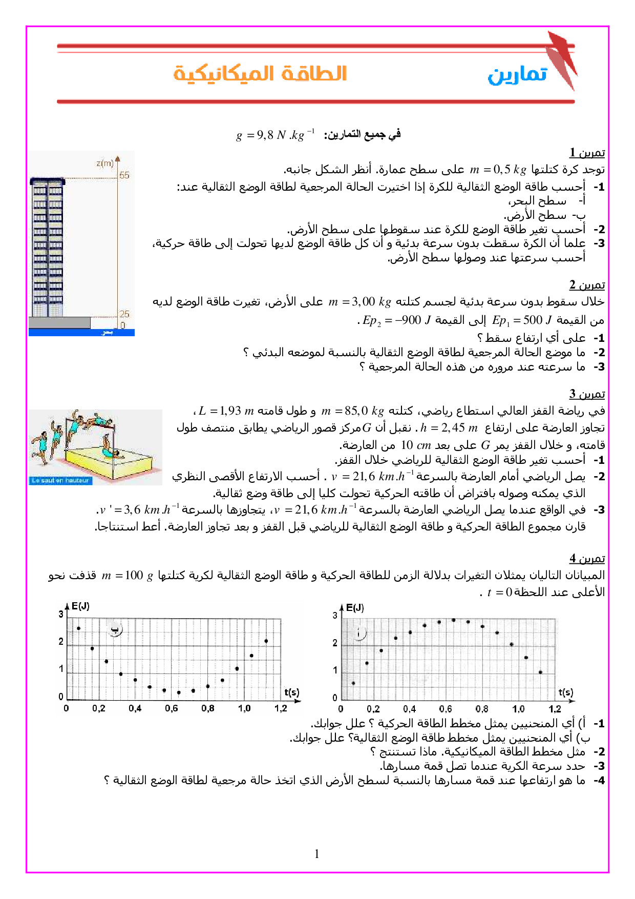 الشغل وطاقة الوضع الثقالية - الطاقة الميكانيكية - سلسلة التمارين 1