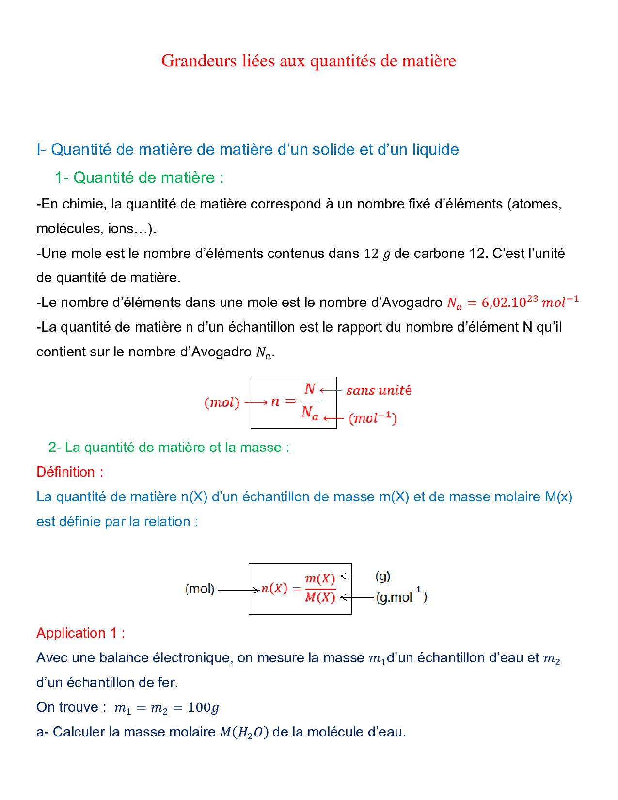 Grandeurs physiques liées à la quantité de matière - Cours 2