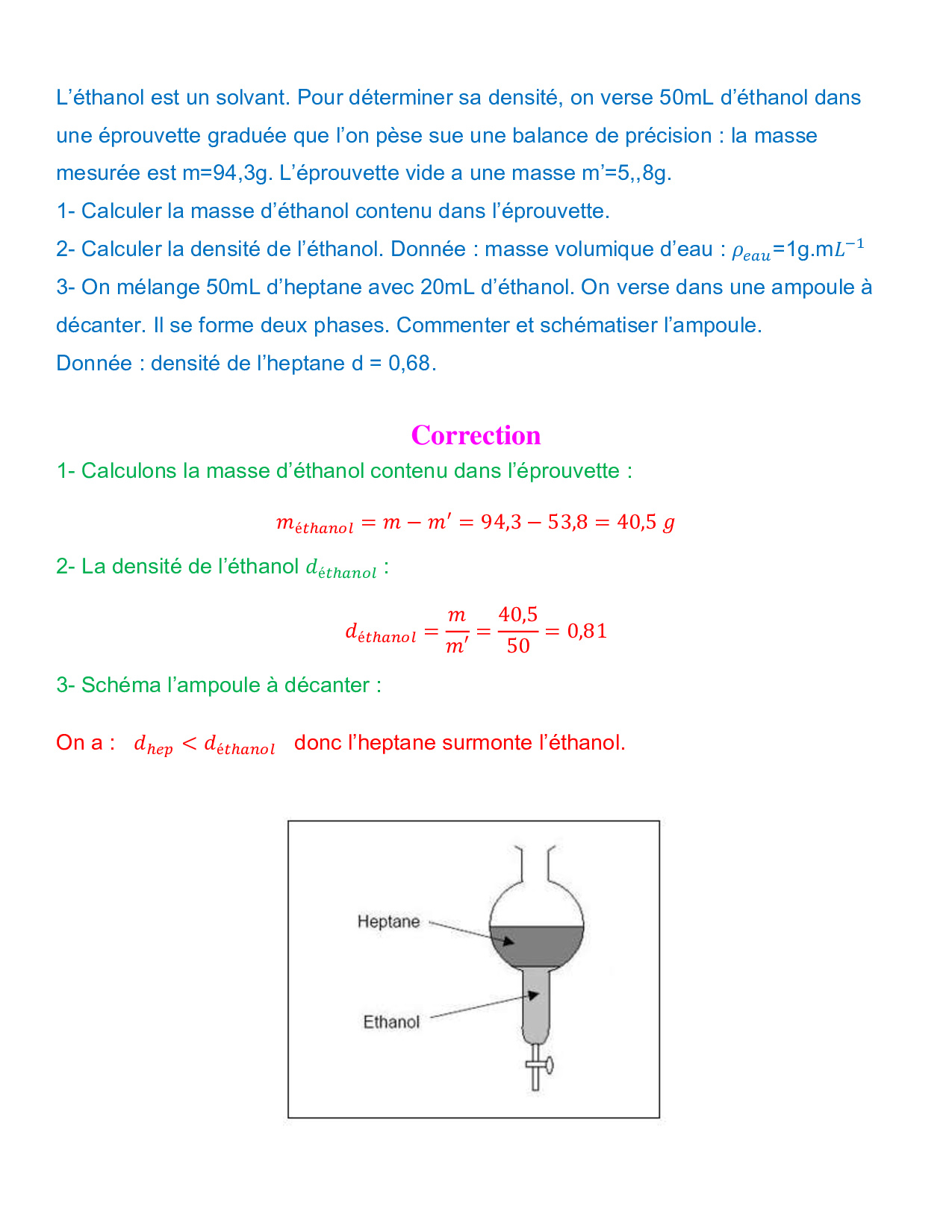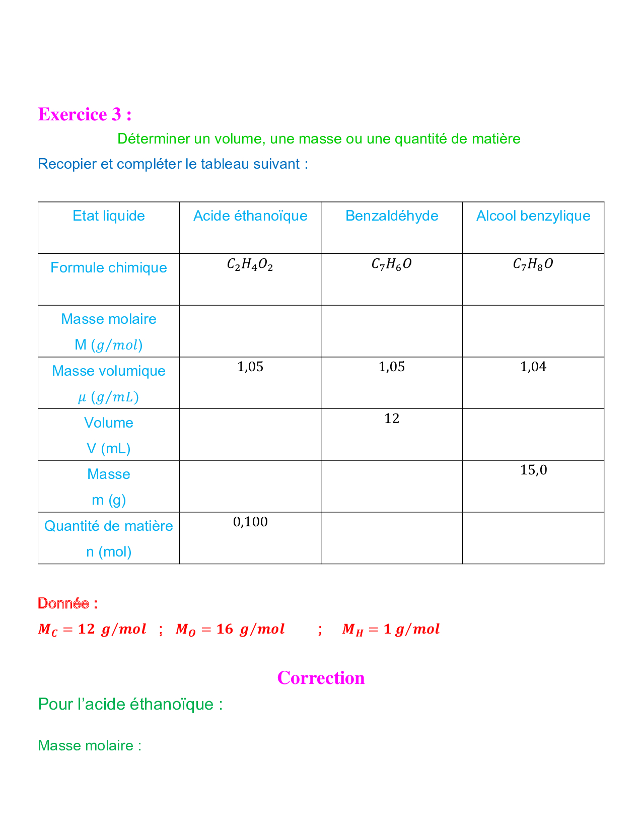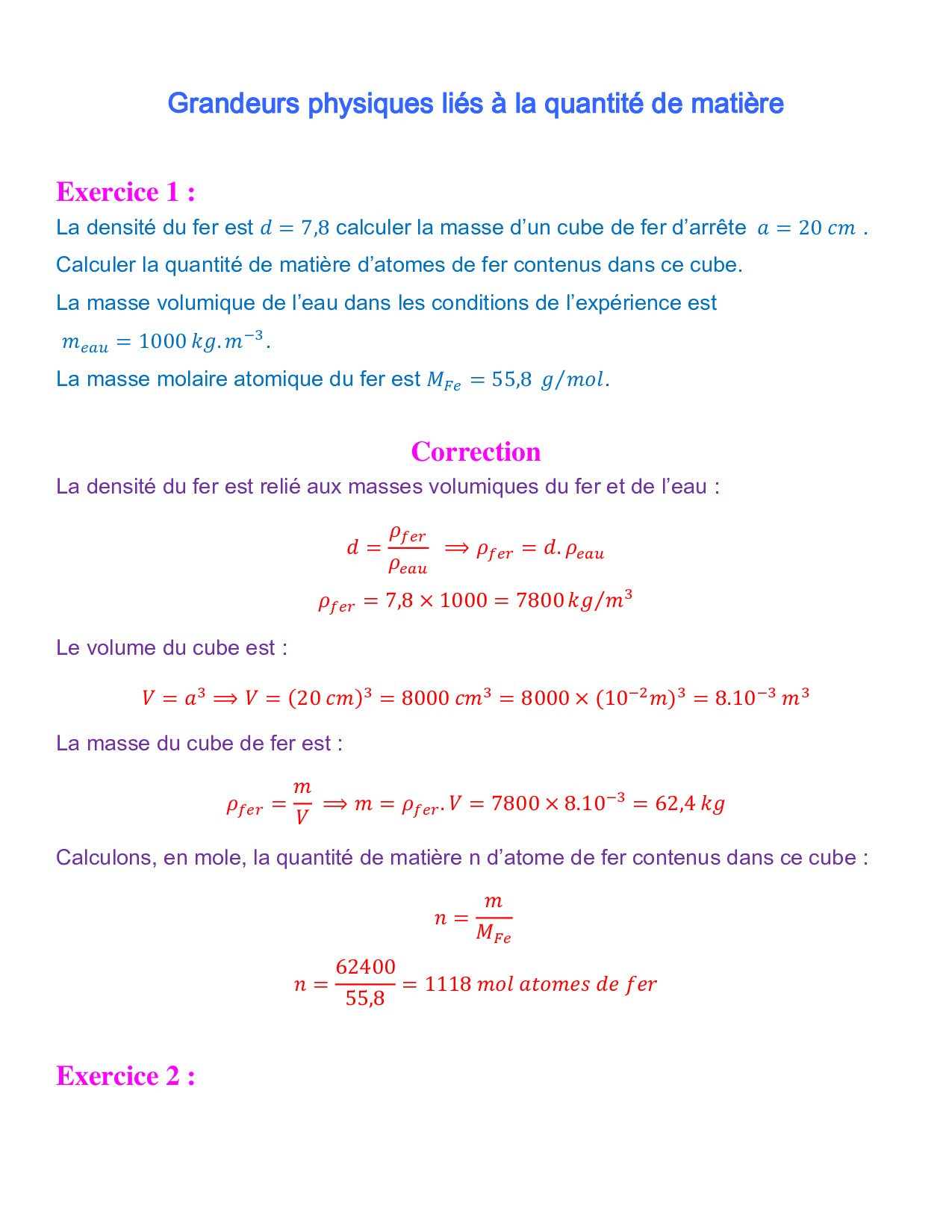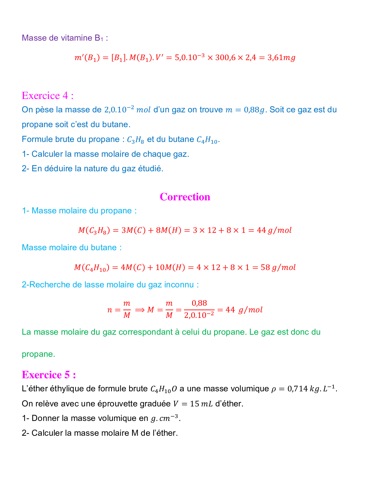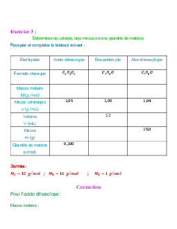 Grandeurs physiques liées à la quantité de matière - Exercices corrigés 1