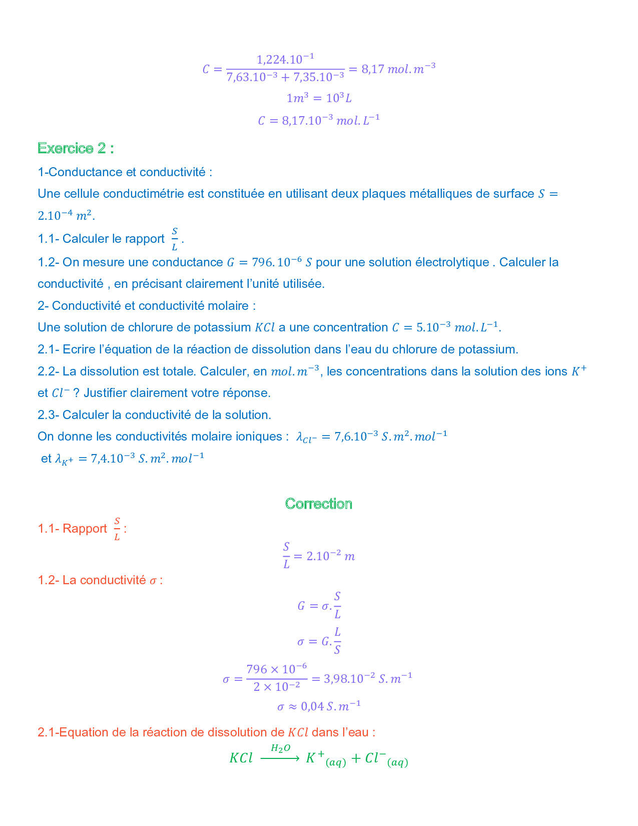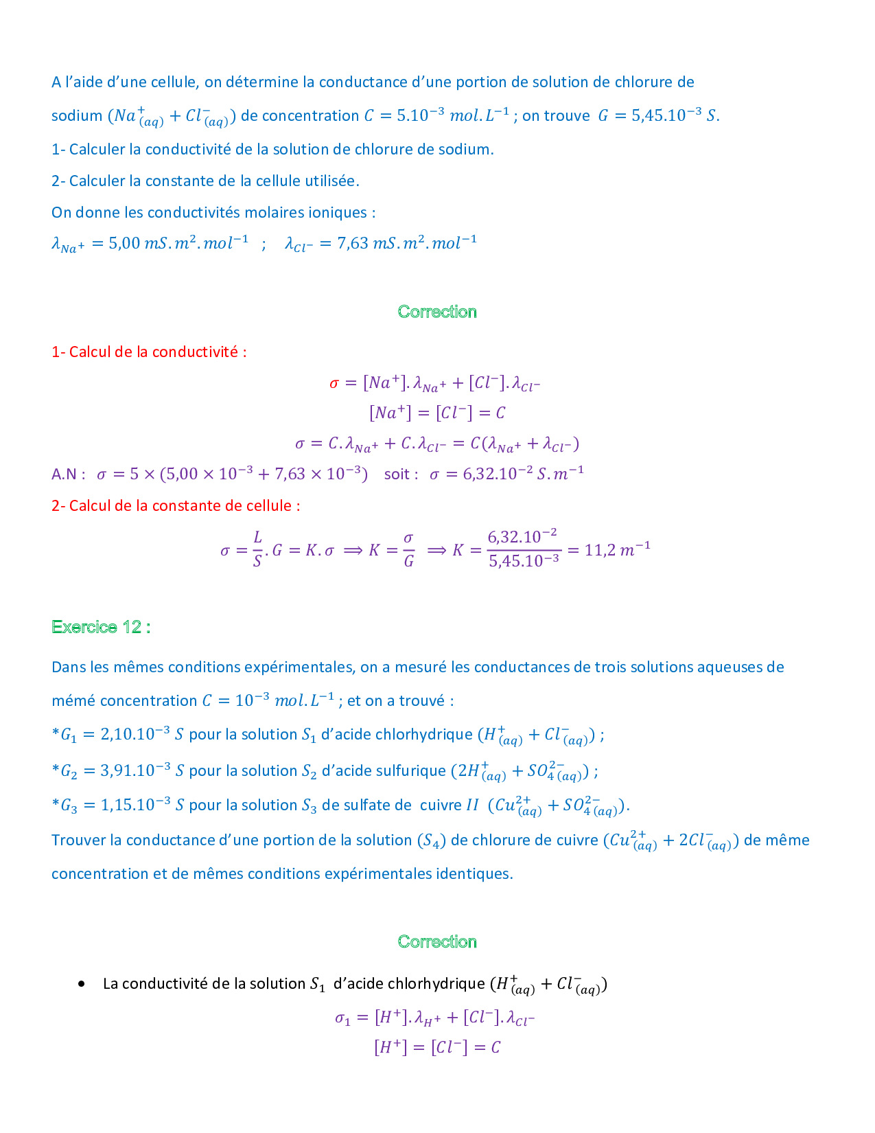 Mesure des quantités de matière en solution par conductimétrie - Exercices corrigés 1