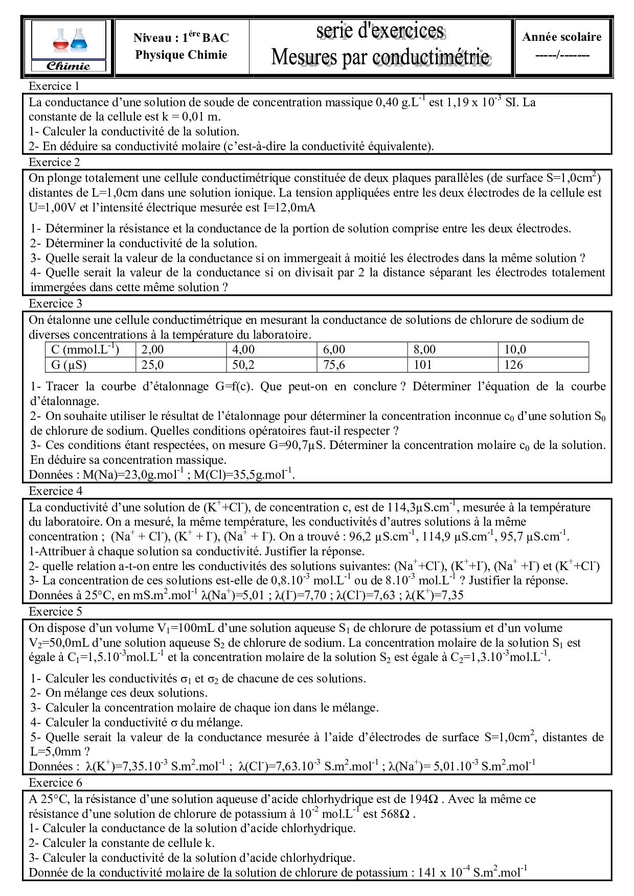 Mesure des quantités de matière en solution par conductimétrie - Exercices non corrigés 4