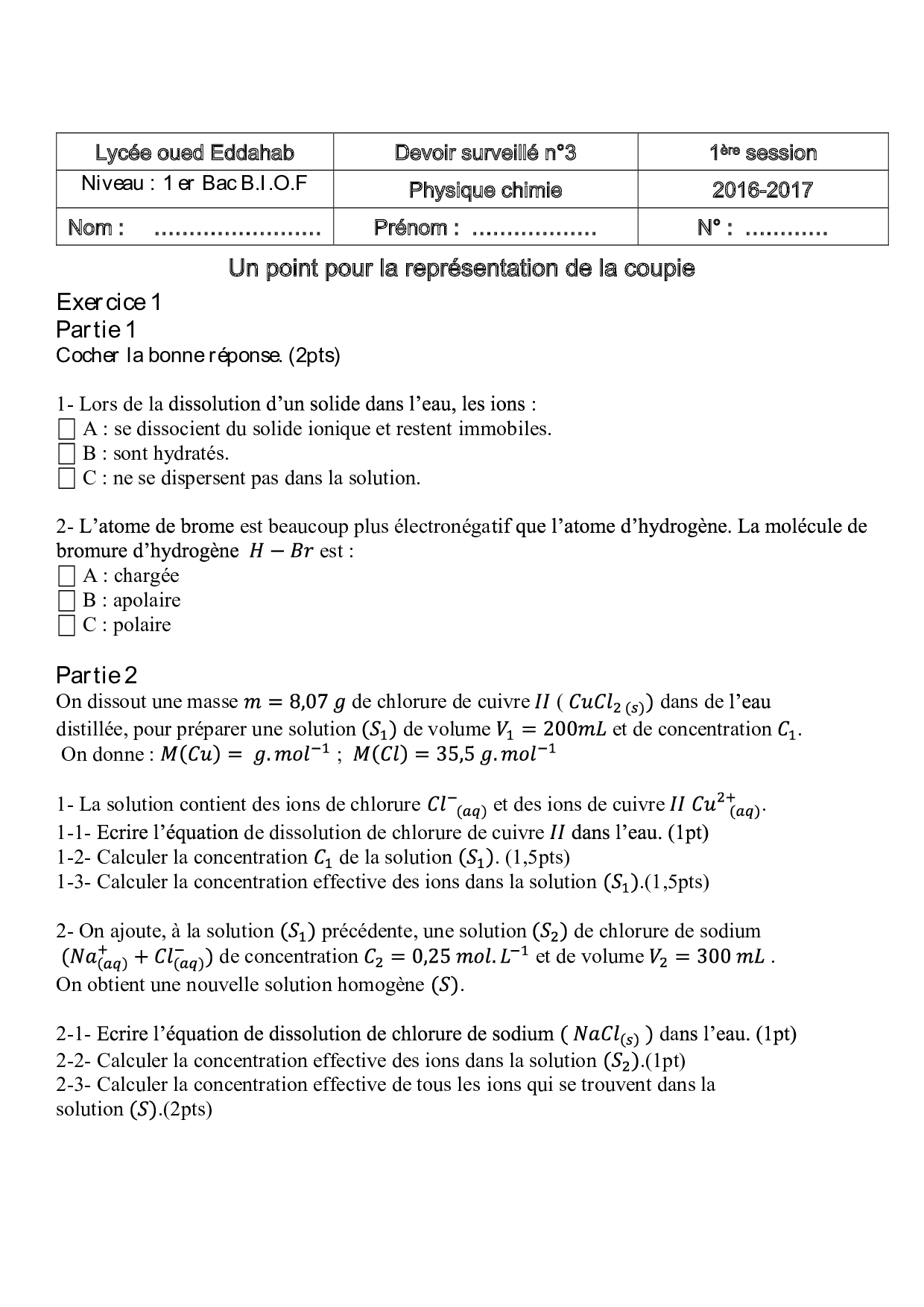 Devoir 3 Modèle 1 - Physique Chimie 1er Bac Semestre 1