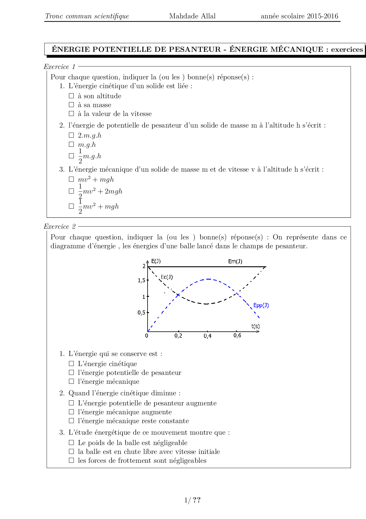 Travail et énergie potentielle de pesanteur - Énergie mécanique - Exercices non corrigés 1