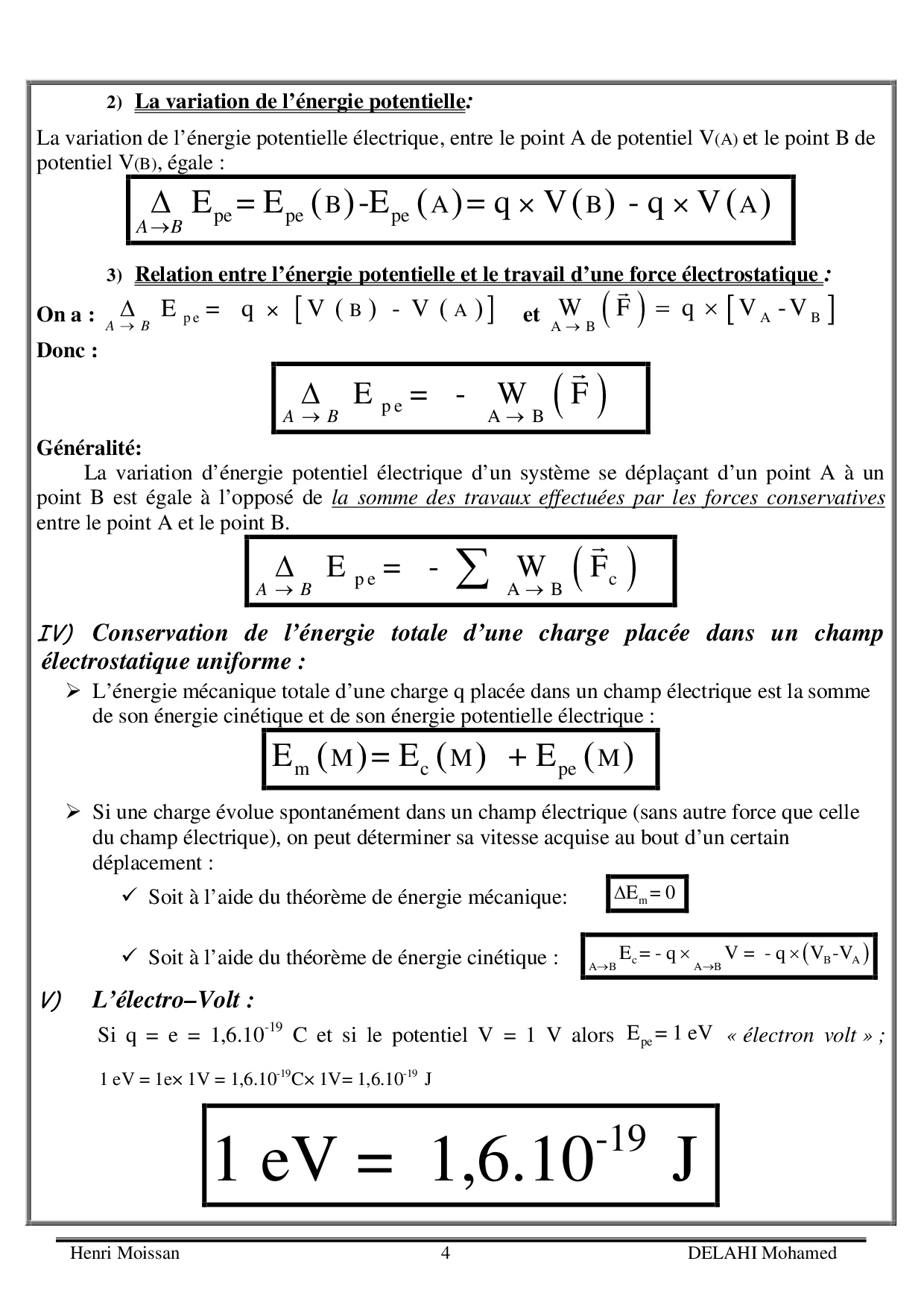 Énergie potentielle d'une charge électrique dans un champ électrique uniforme (Sciences Maths)