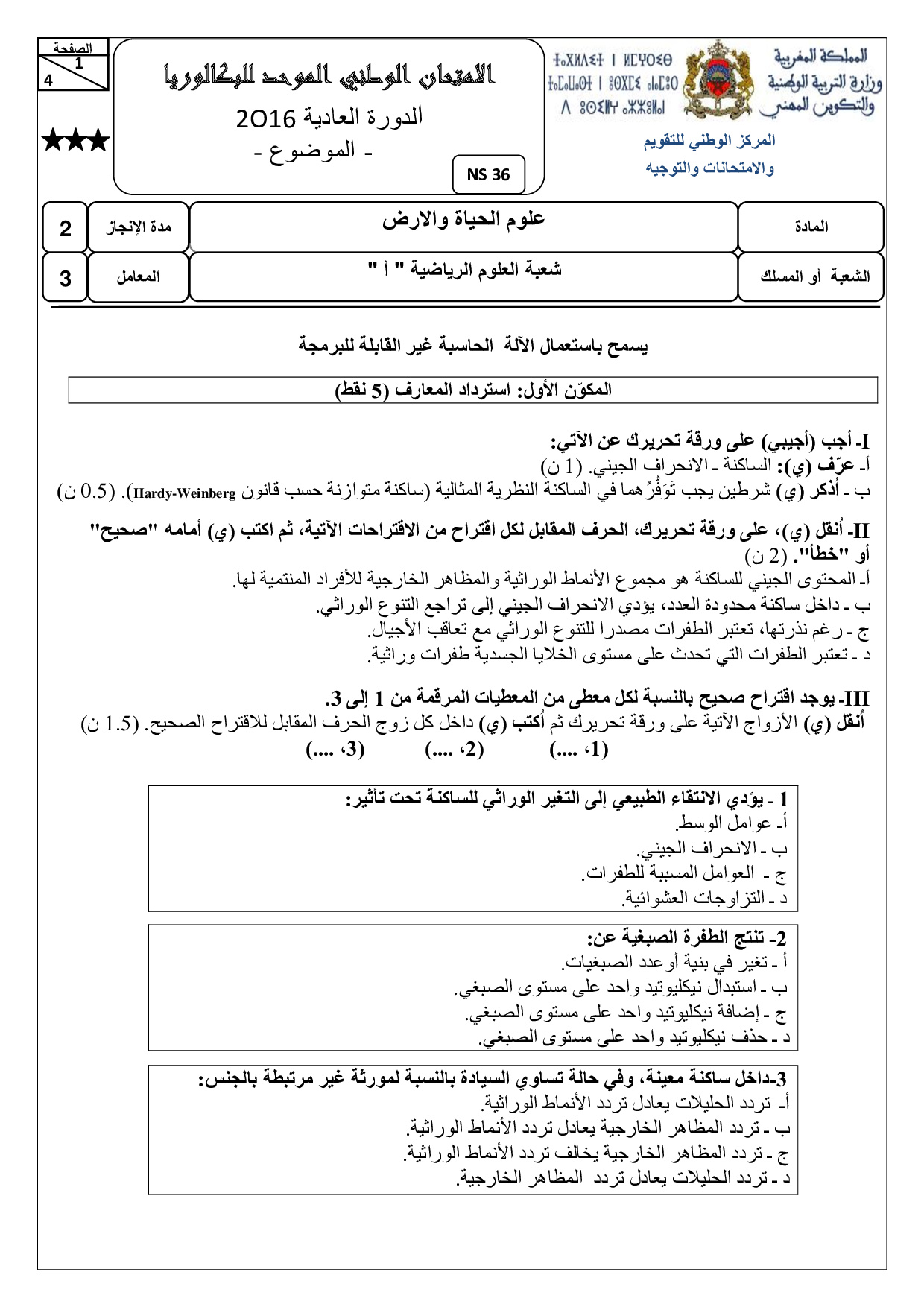 علوم الحياة والارض علوم رياضية أ 2016 الدورة العادية - الموضوع