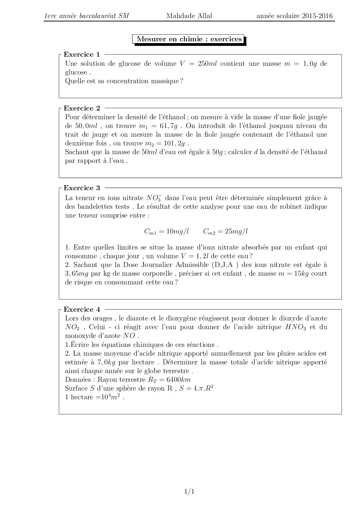 Importance de la mesure en chimie - Exercices non corrigés 1