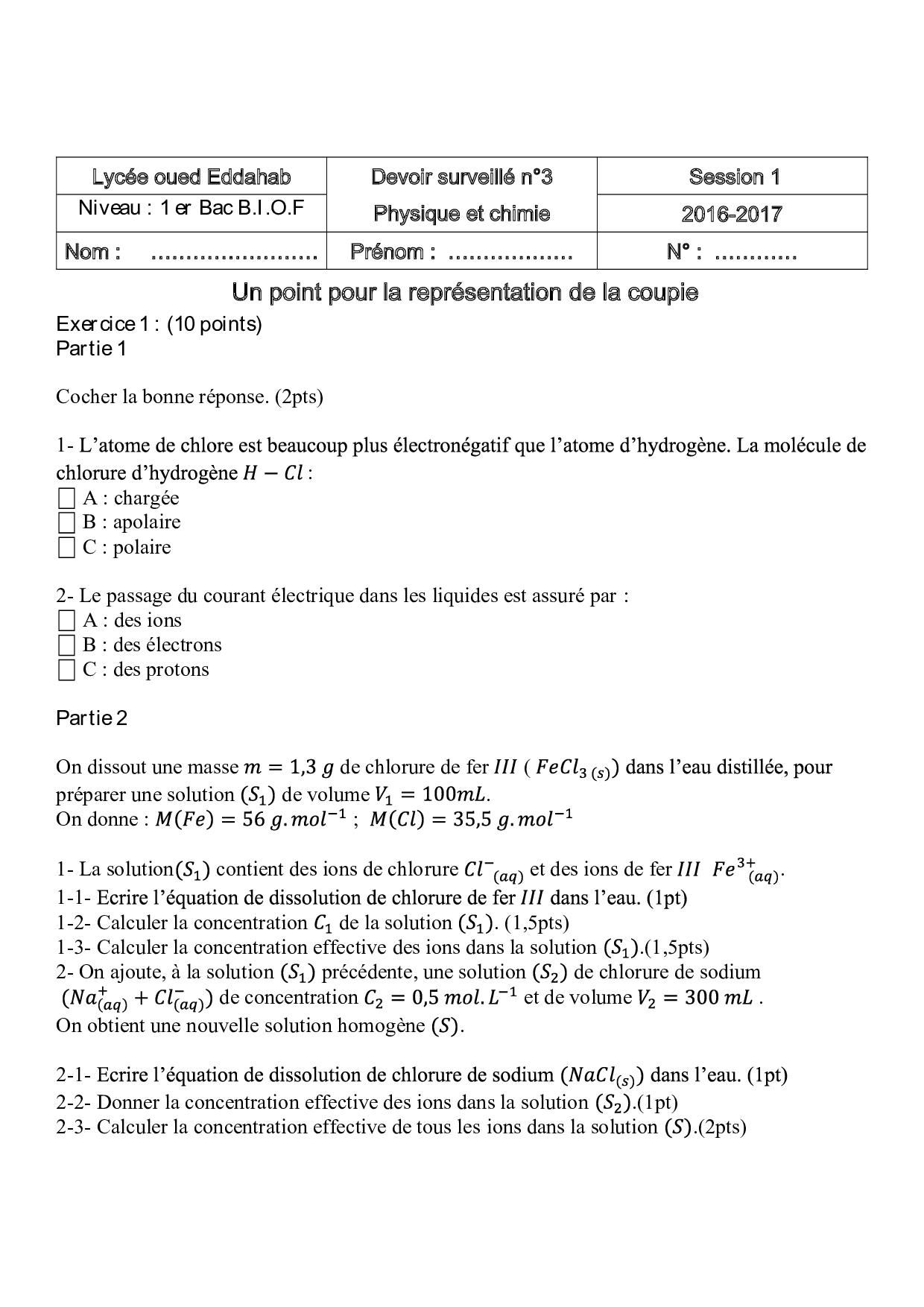 Devoir 3 Modèle 2 - Physique Chimie 1er Bac Semestre 1