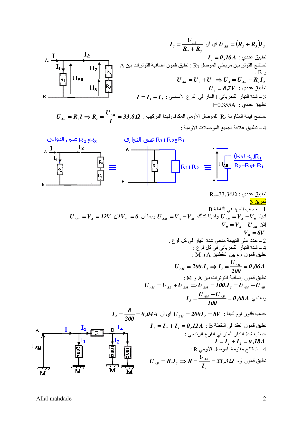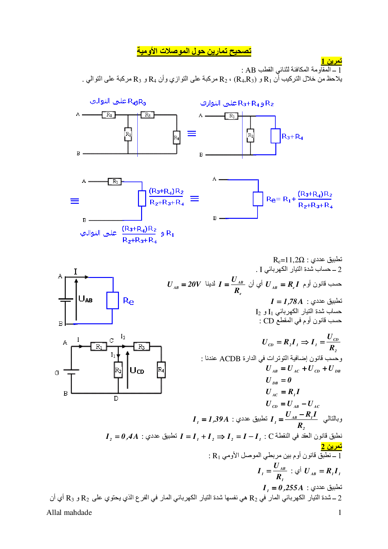 تجميع الموصلات الأومية - تصحيح سلسلة التمارين 2