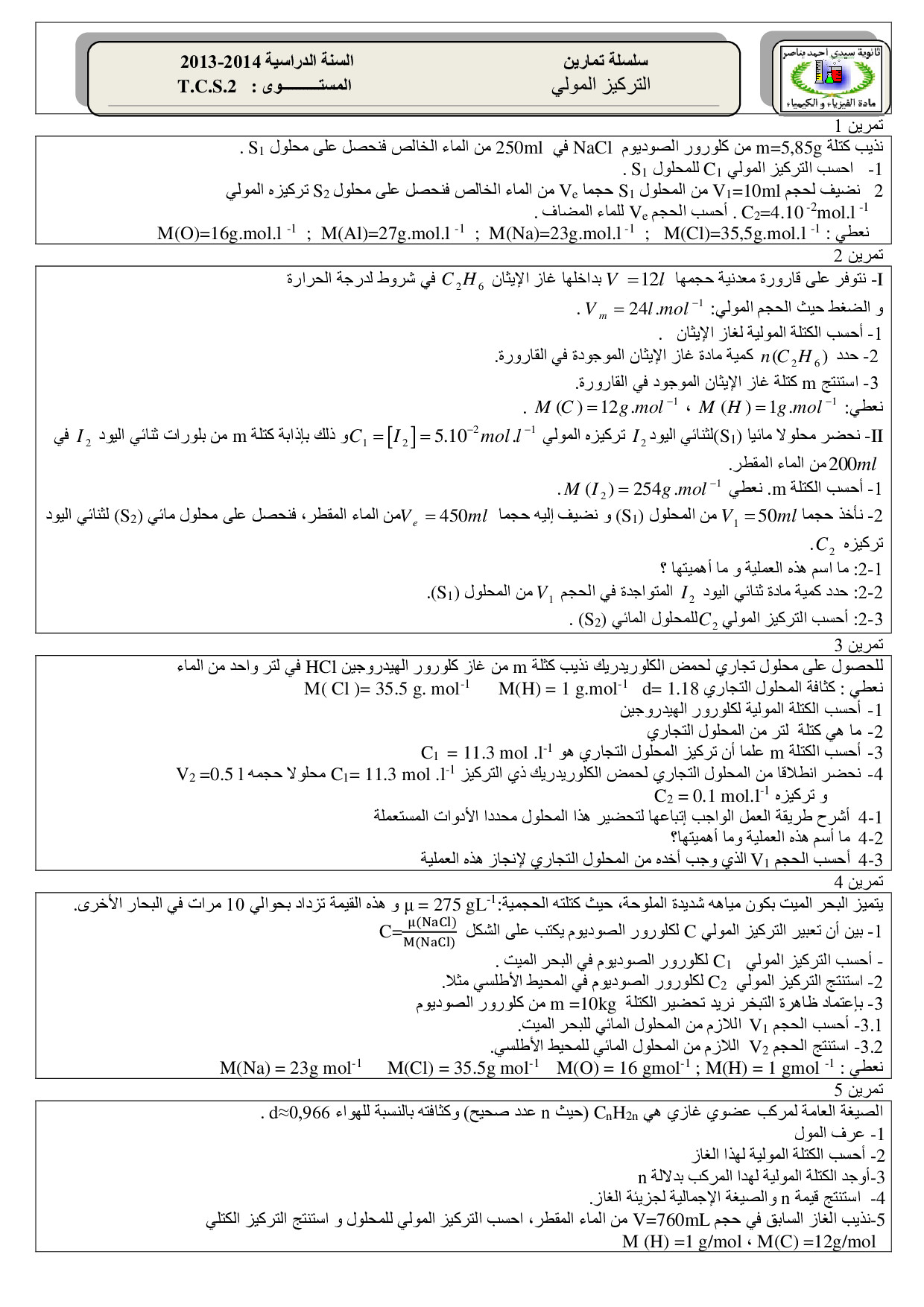 التركيز المولي للأنواع الكيميائية في محلول - تمارين غير محلولة 2