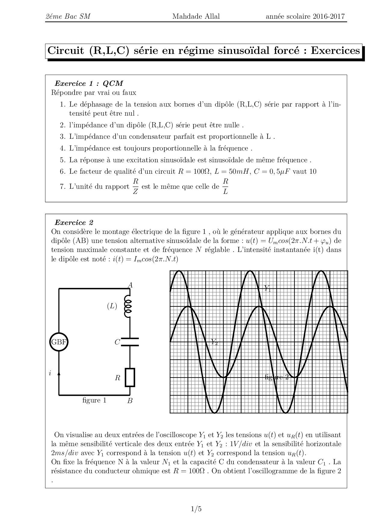 Circuit RLC série en régime sinusoïdal forcé - Exercices non corrigés 1