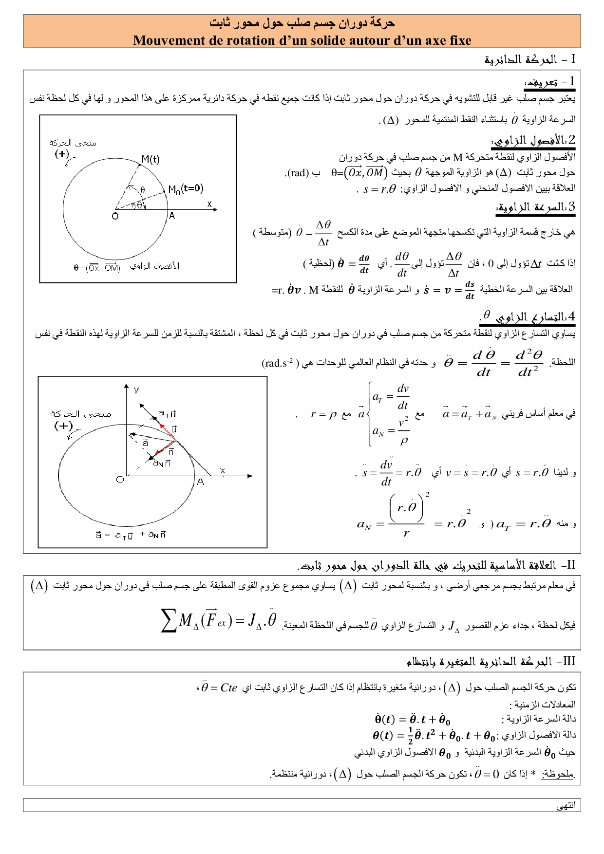 حركة دوران جسم صلب حول محور ثابت - ملخص الدرس 1