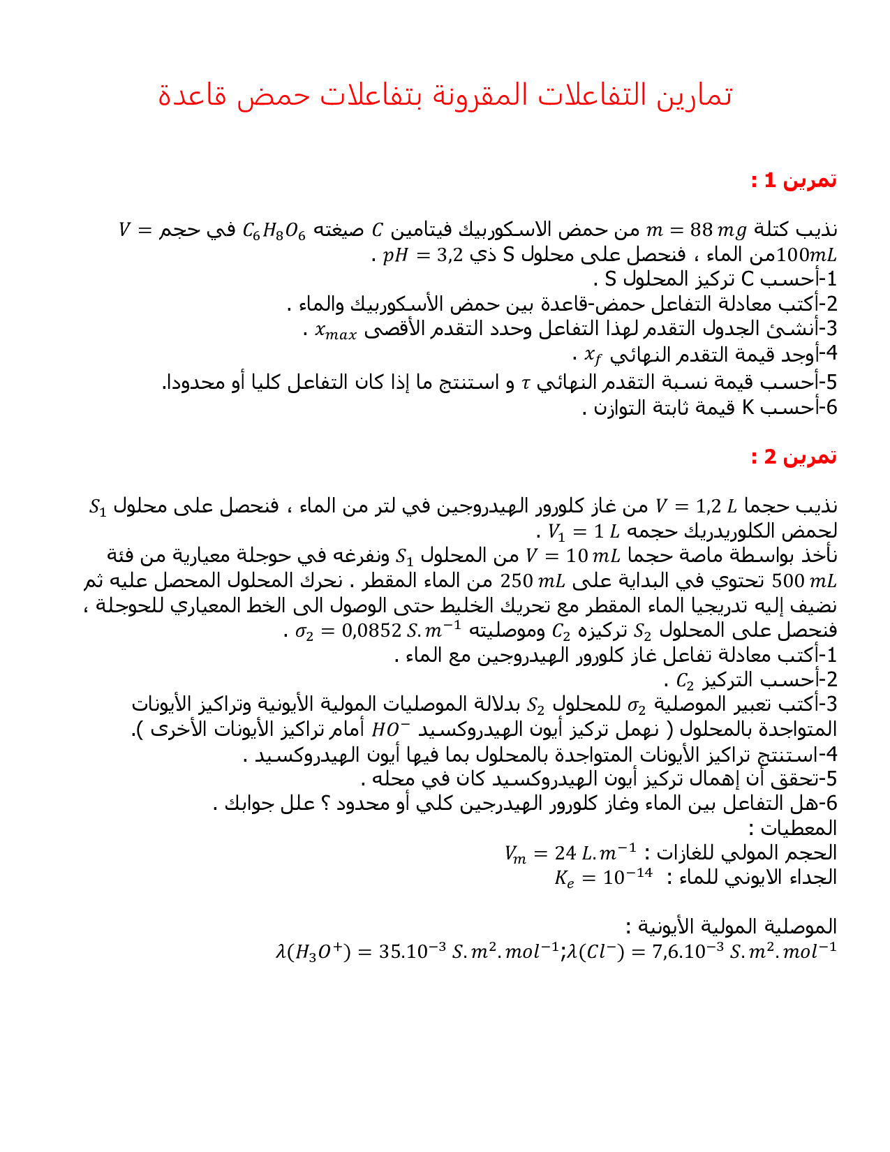التحولات الكيميائية المقرونة بالتفاعلات حمض قاعدة - سلسلة التمارين 3