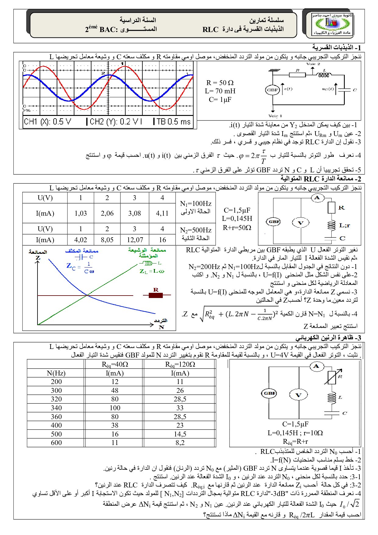التذبذبات القسرية في دارة RLC متوالية - أنشطة 1