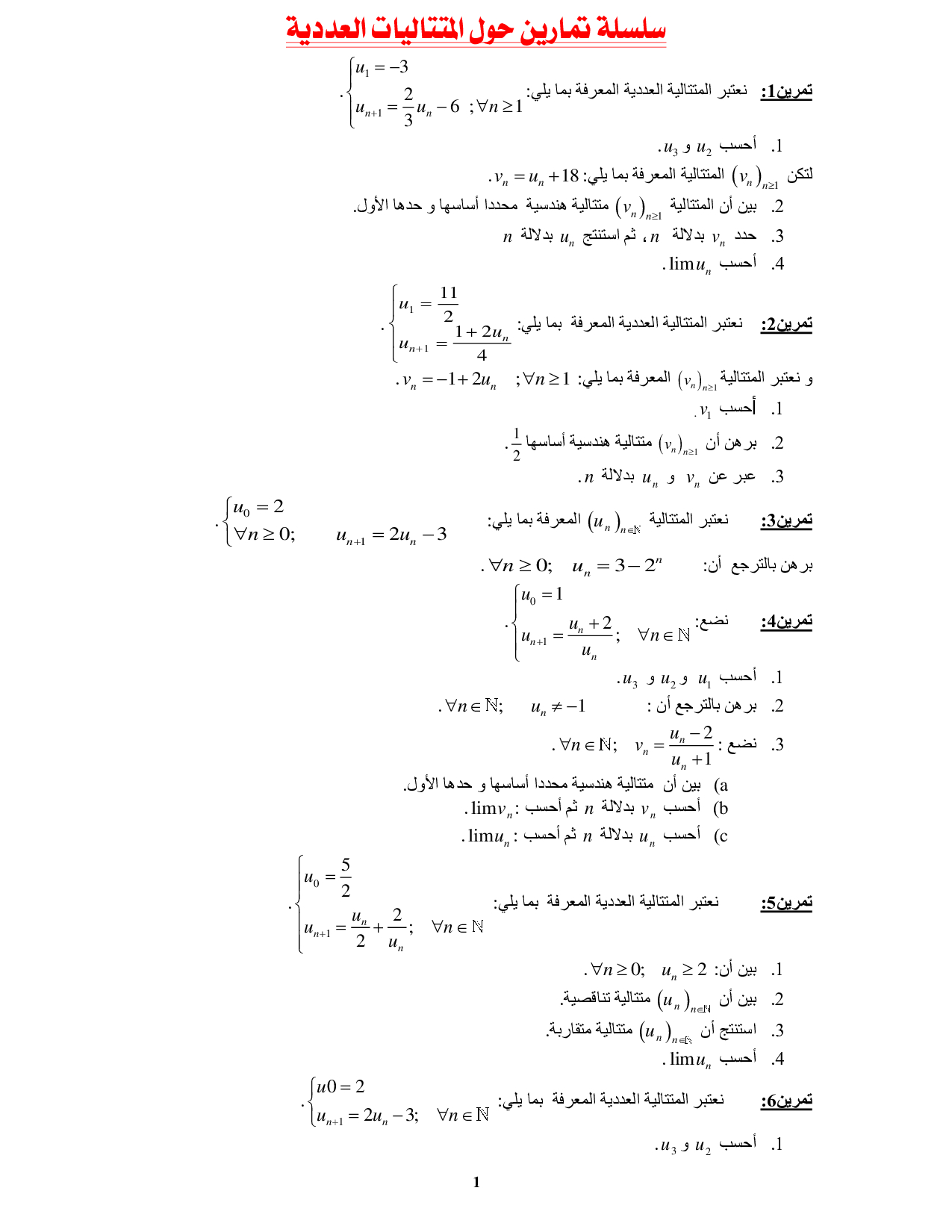 المتتاليات العددية - تمارين غير محلولة 3