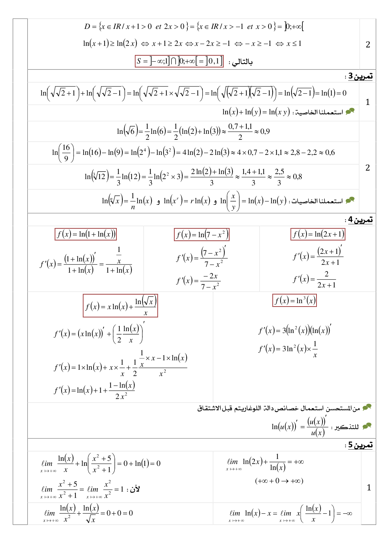 الدوال اللوغاريتمية - تصحيح سلسلة التمارين 3