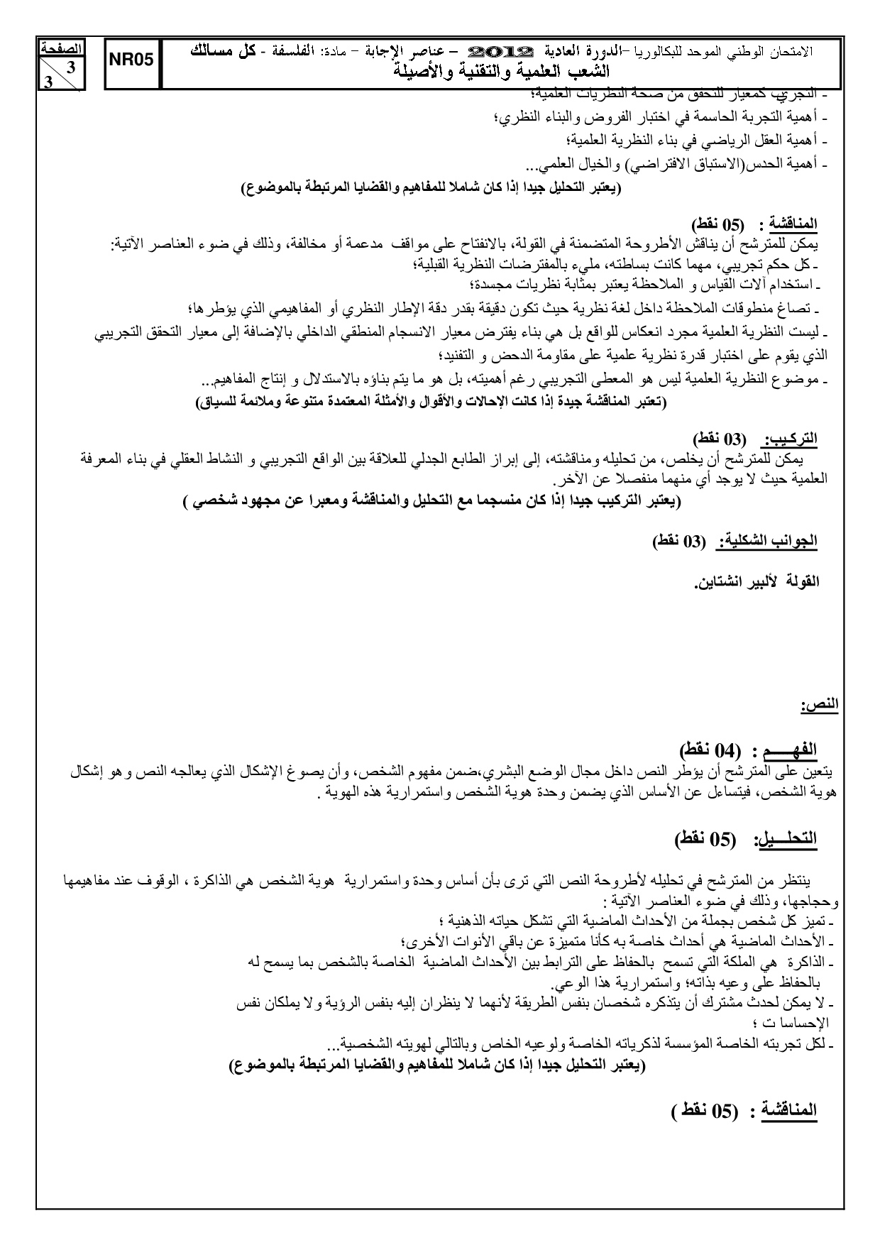 الفلسفة للشعب العلمية والتقنية 2012 الدورة العادية - التصحيح