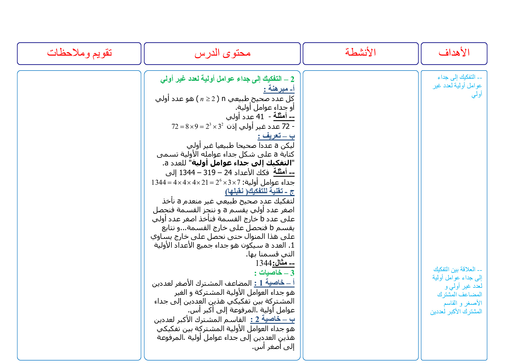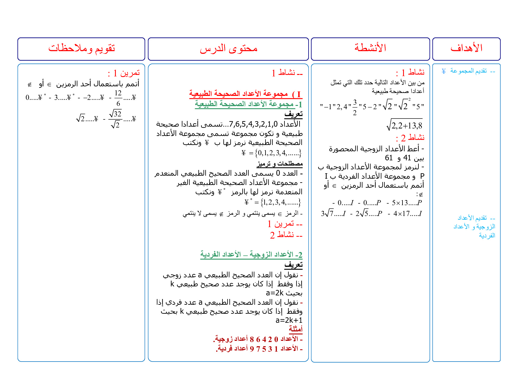 جذاذة درس مجموعة الأعداد الصحيحة الطبيعية و مبادئ في الحسابيات