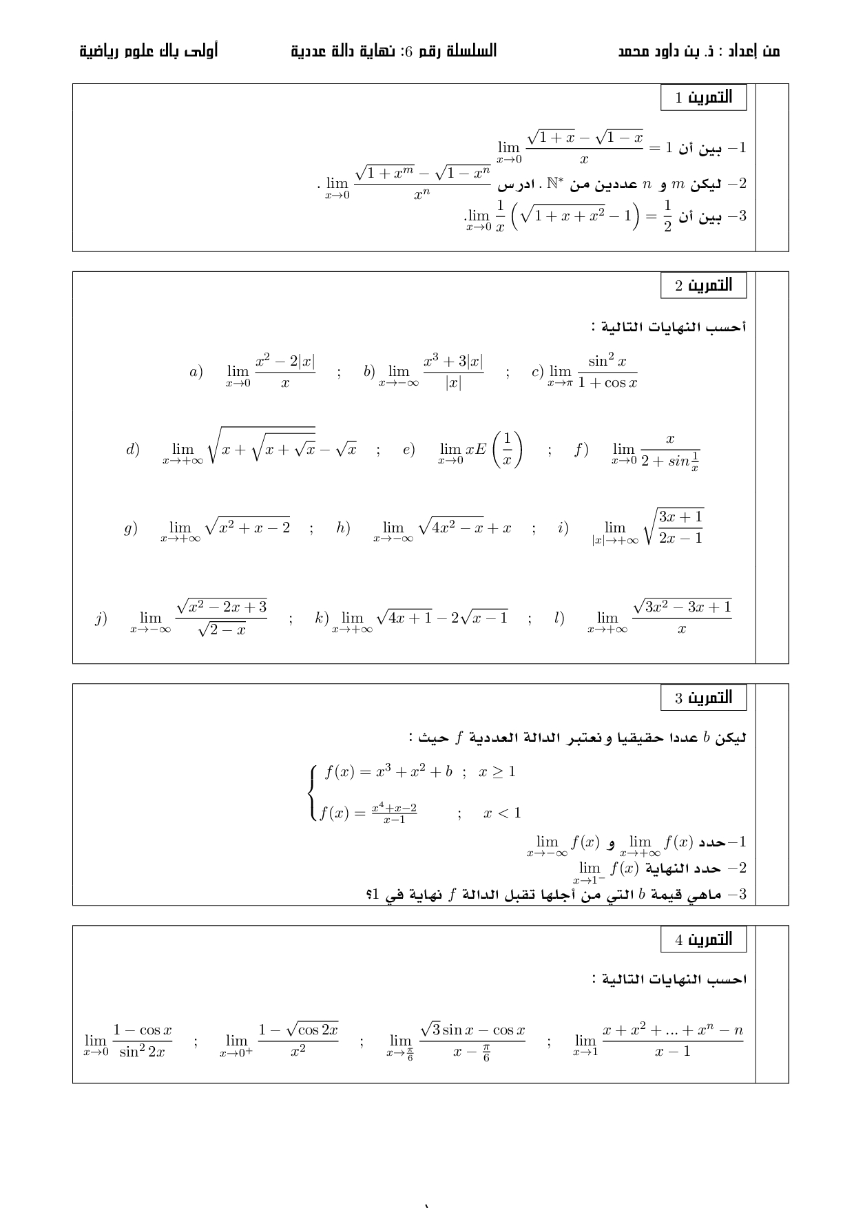 نهاية دالة عددية - تمارين غير محلولة 1
