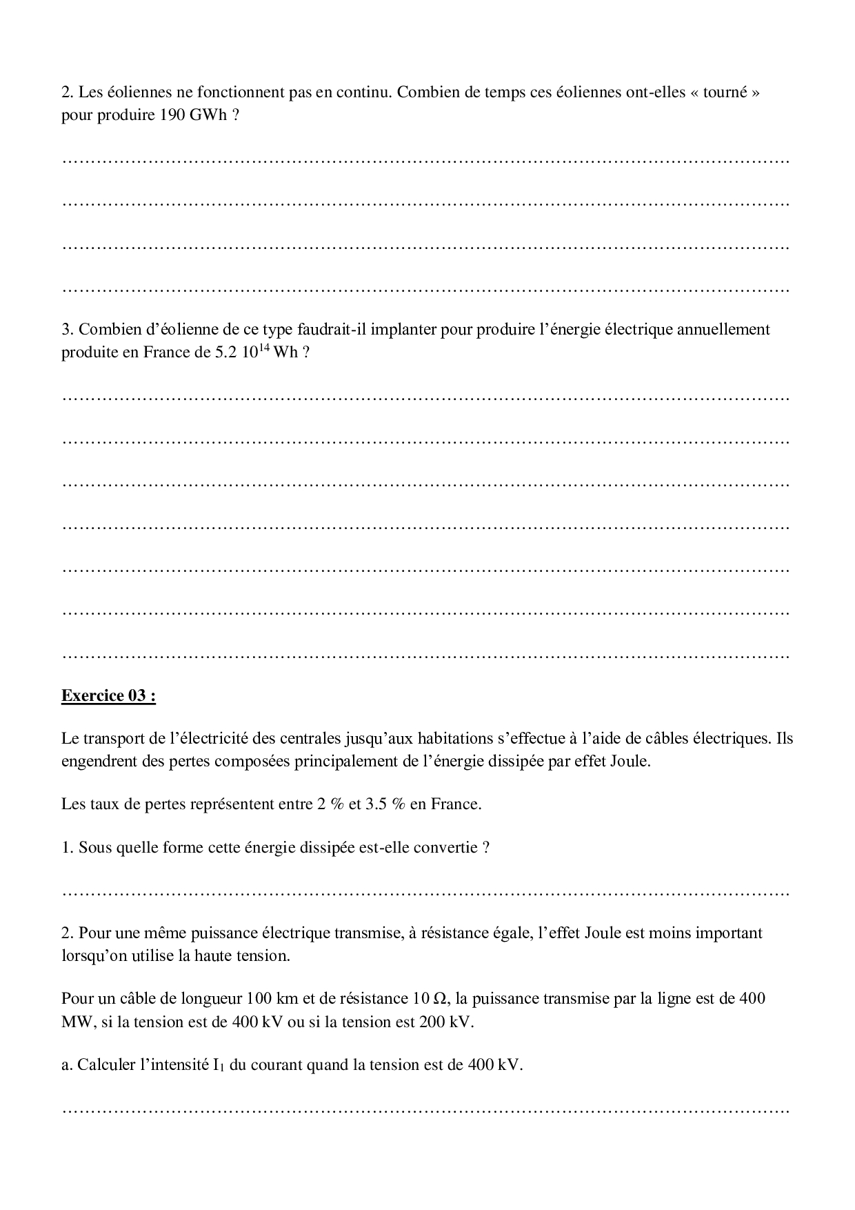 Transport de l’énergie électrique – Exercices