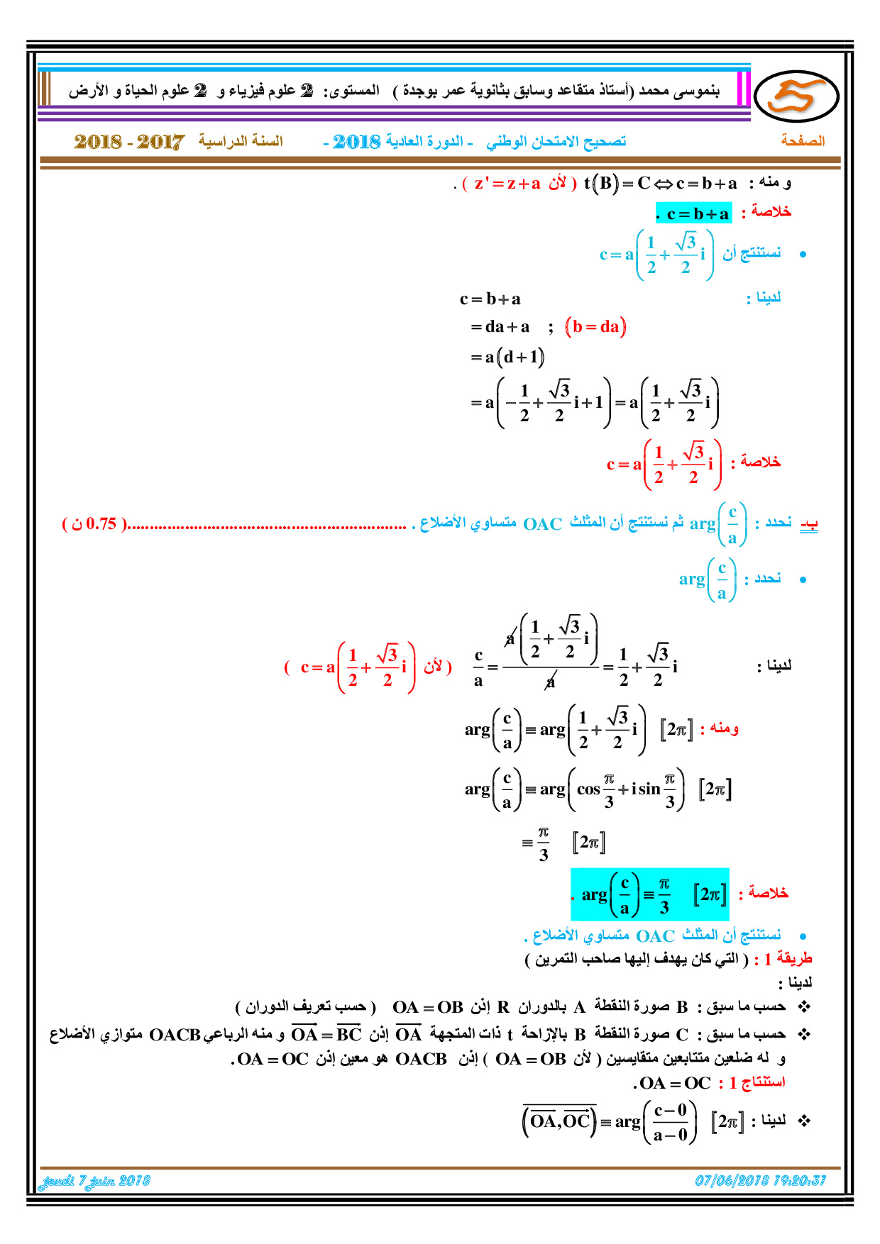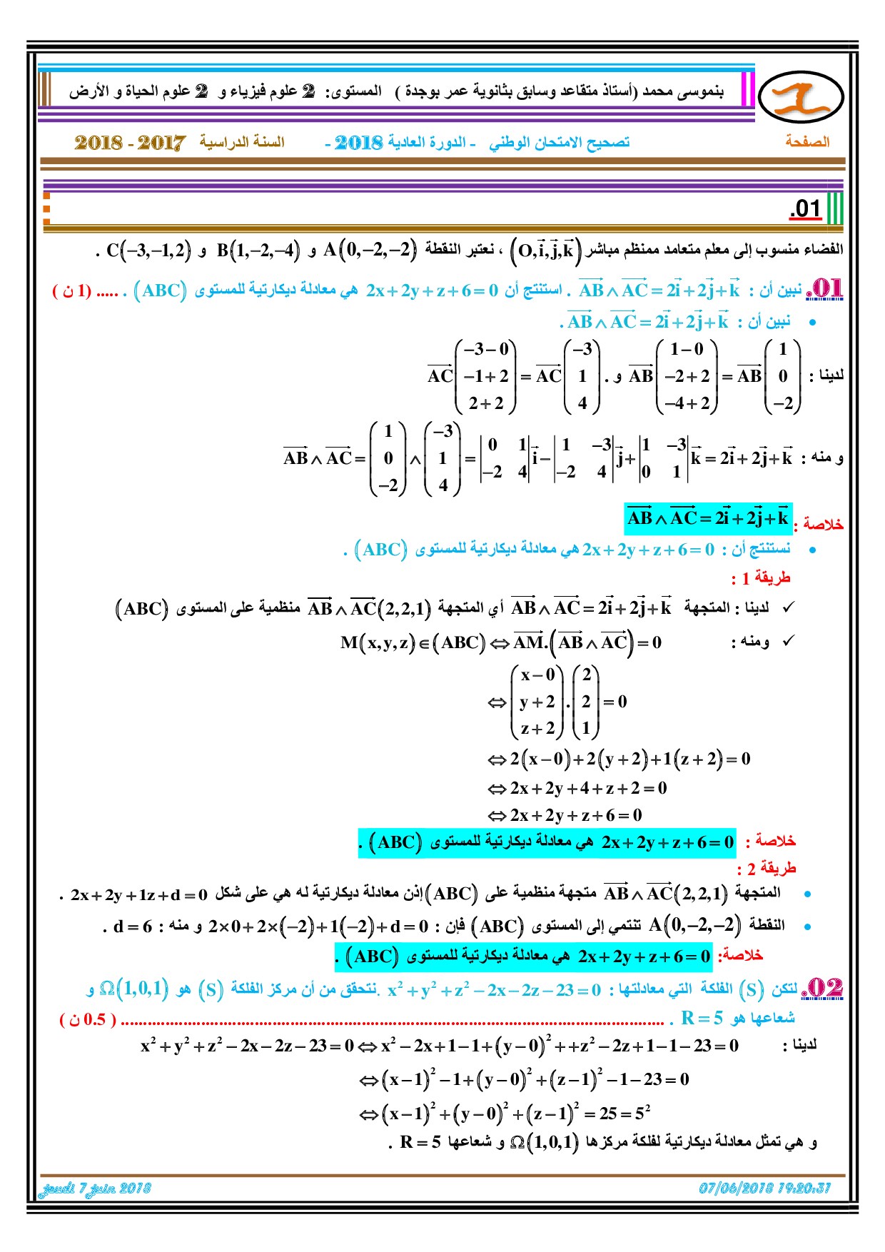 الرياضيات للشعب العلمية والتكنولوجية 2018 الدورة العادية - التصحيح