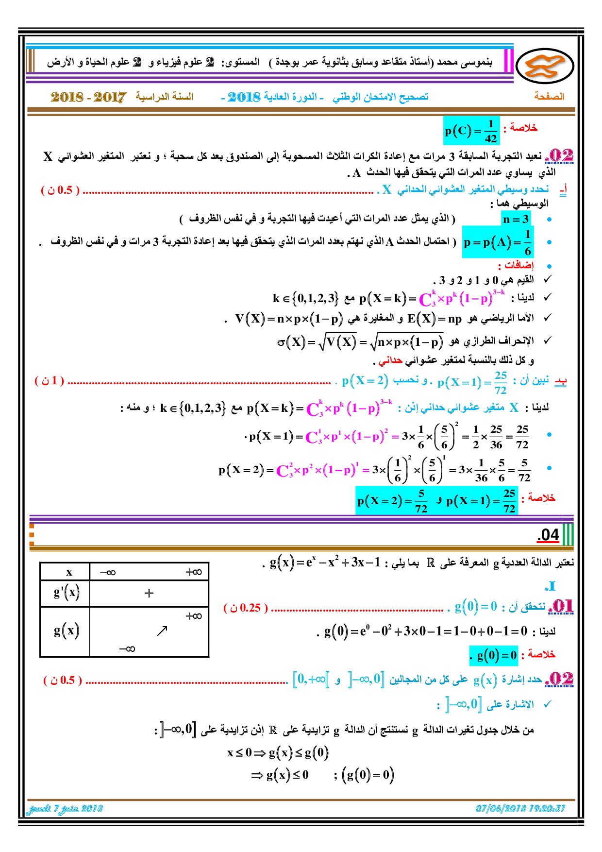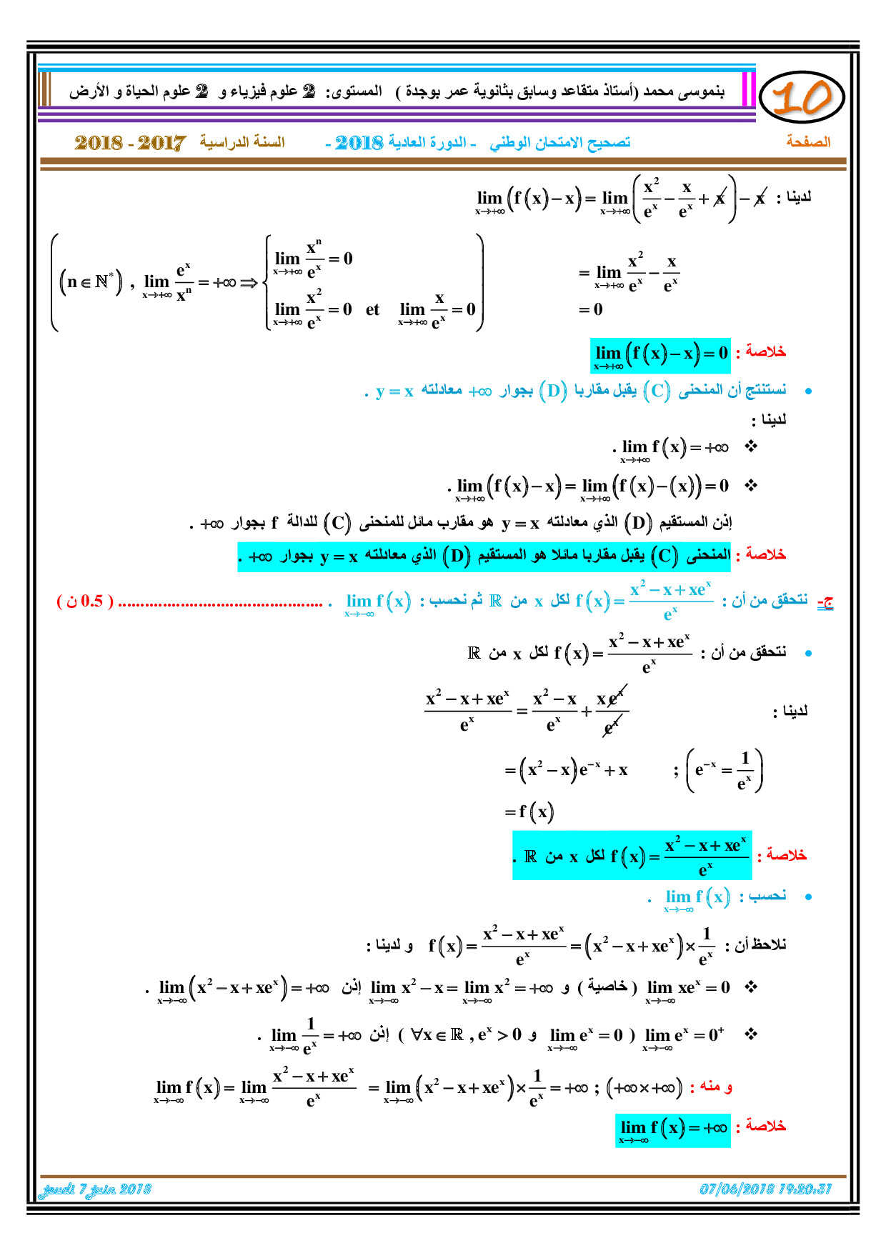 الرياضيات للشعب العلمية والتكنولوجية 2018 الدورة العادية - التصحيح