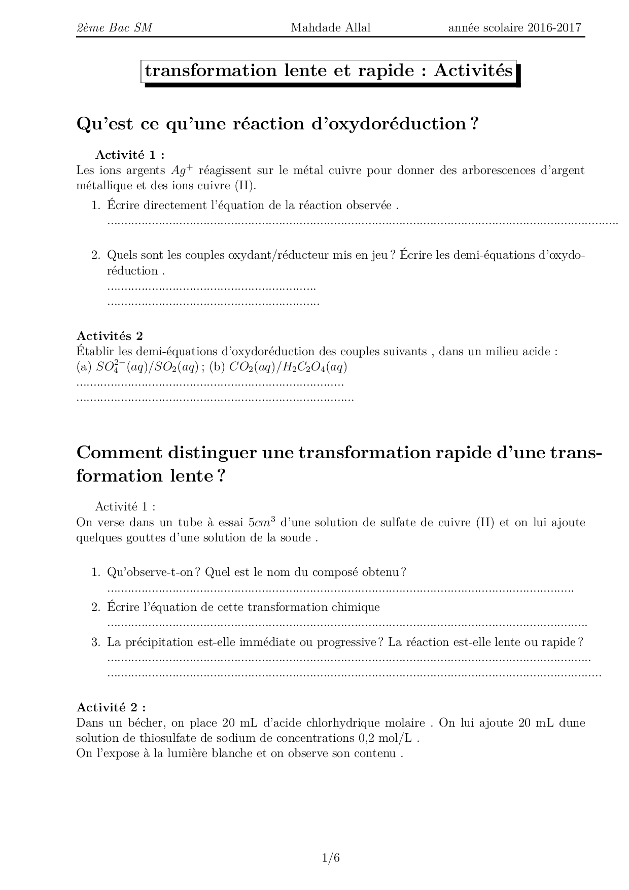Transformations lentes et transformations rapides - Activités 1