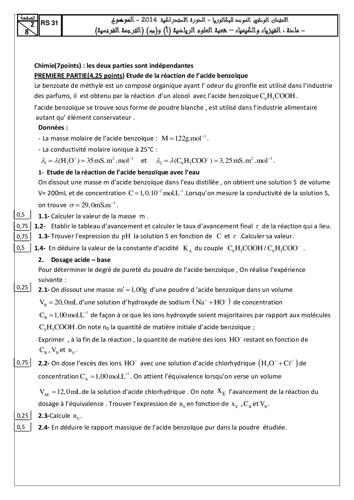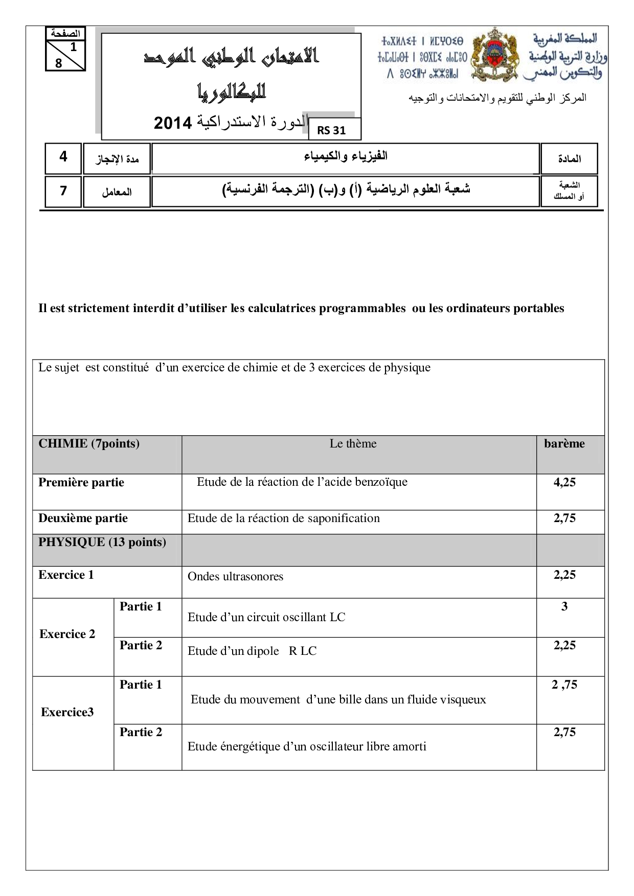 Examen National Physique-Chimie Sciences Maths 2014 Rattrapage - Sujet