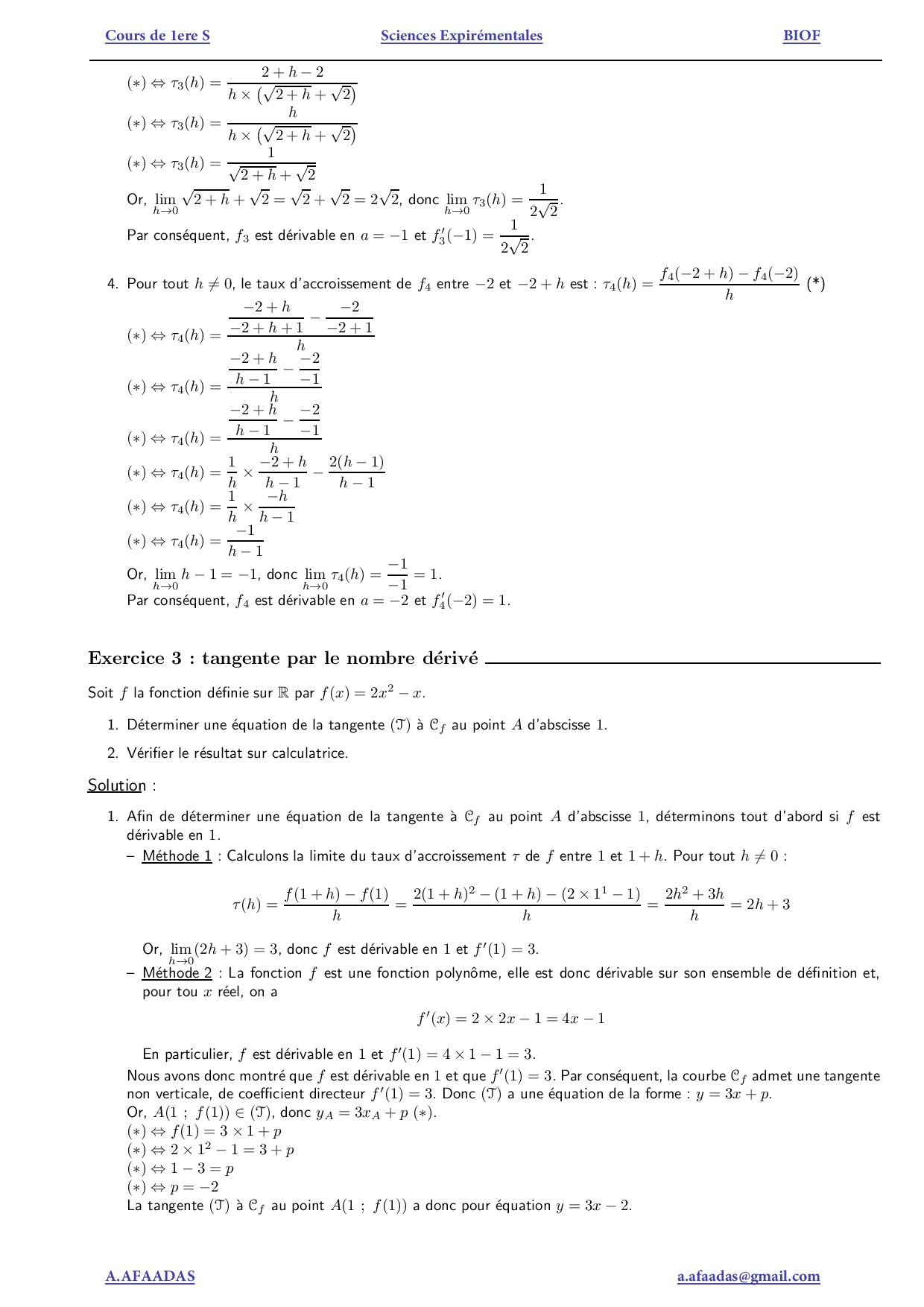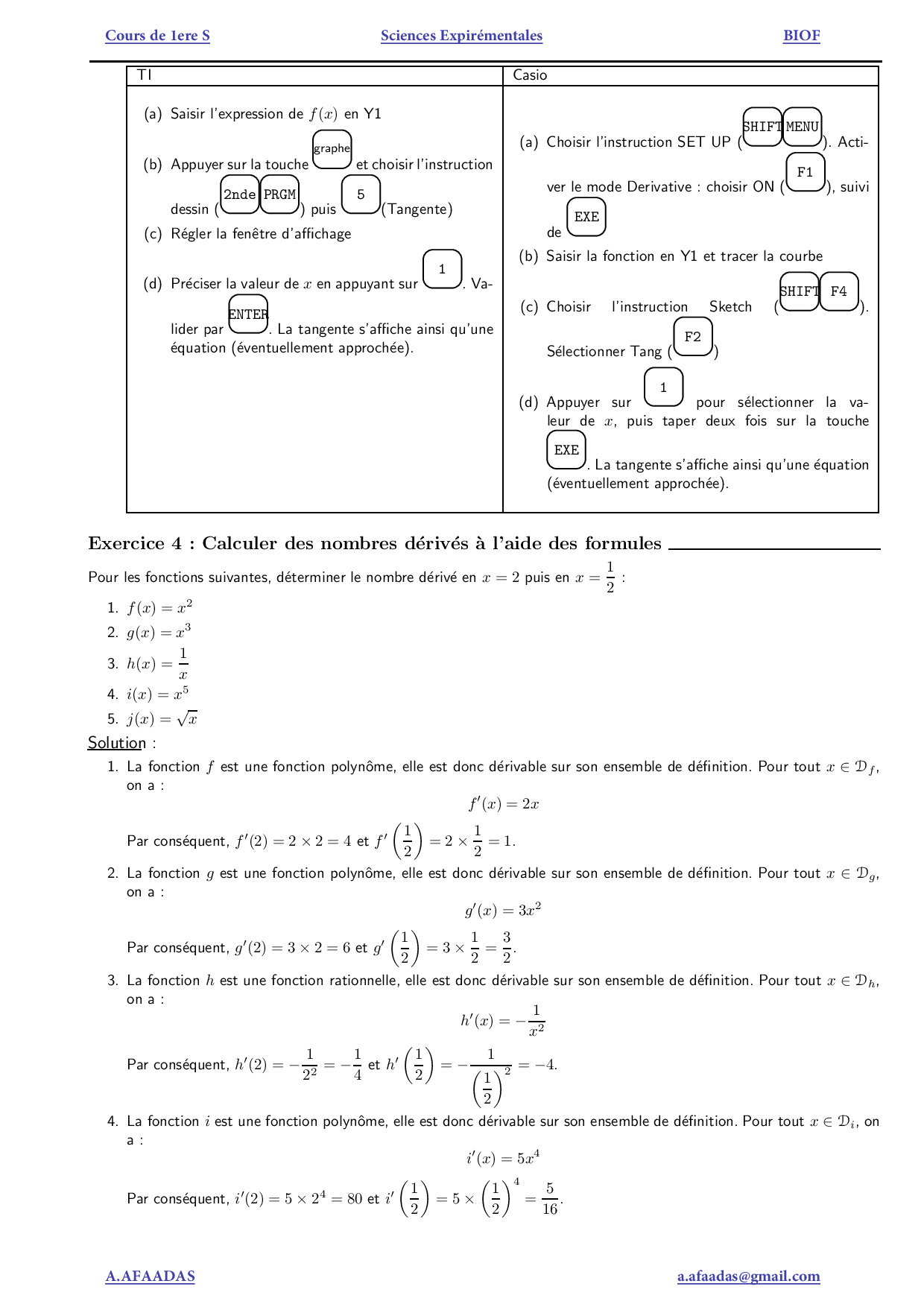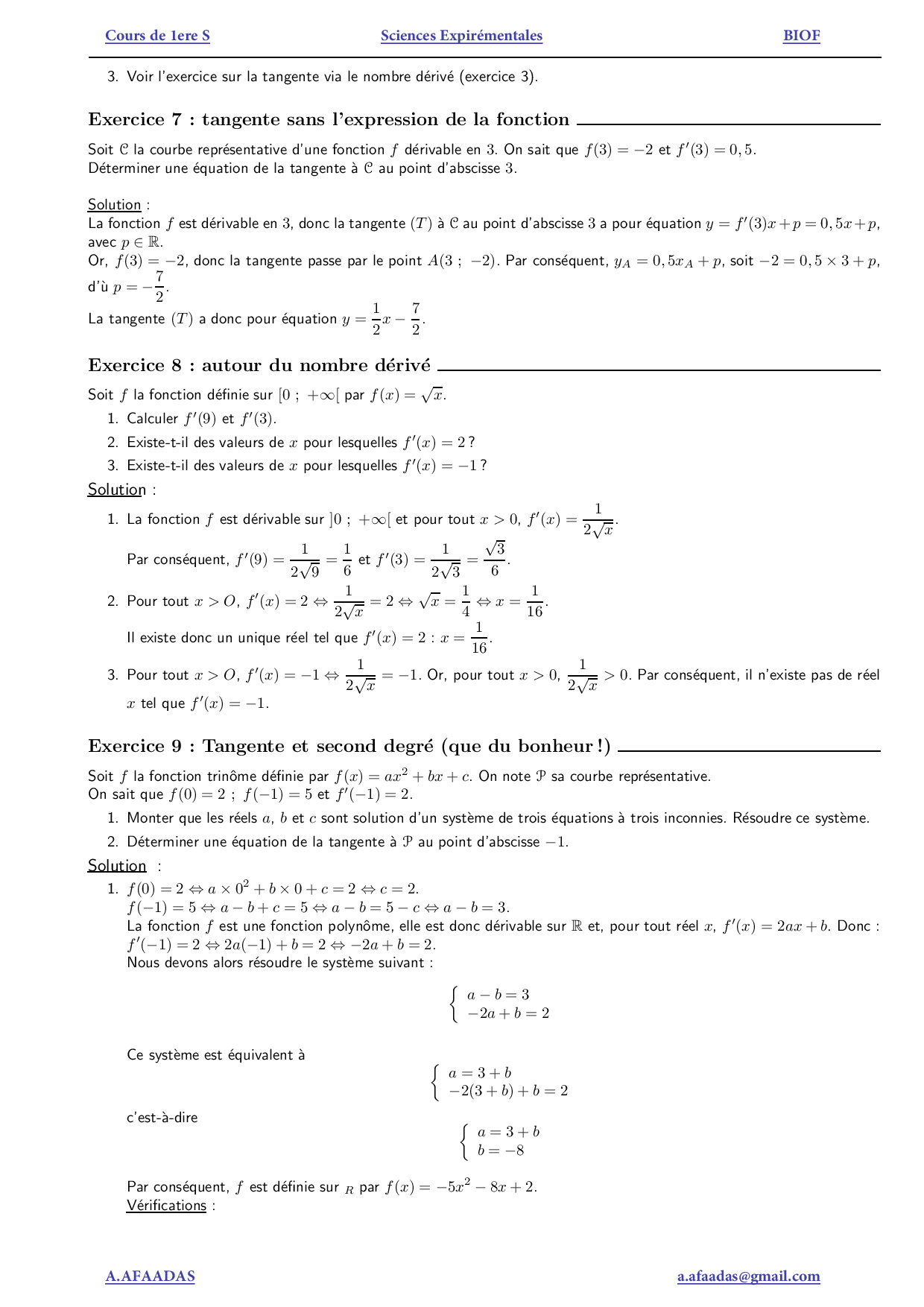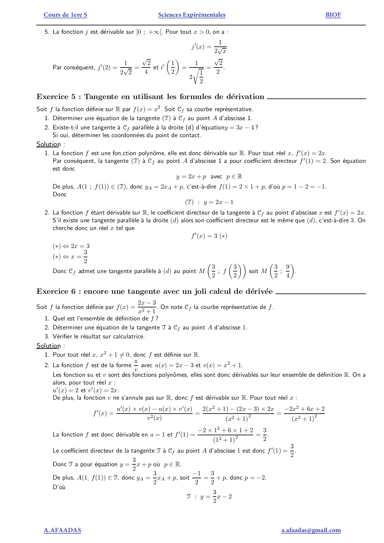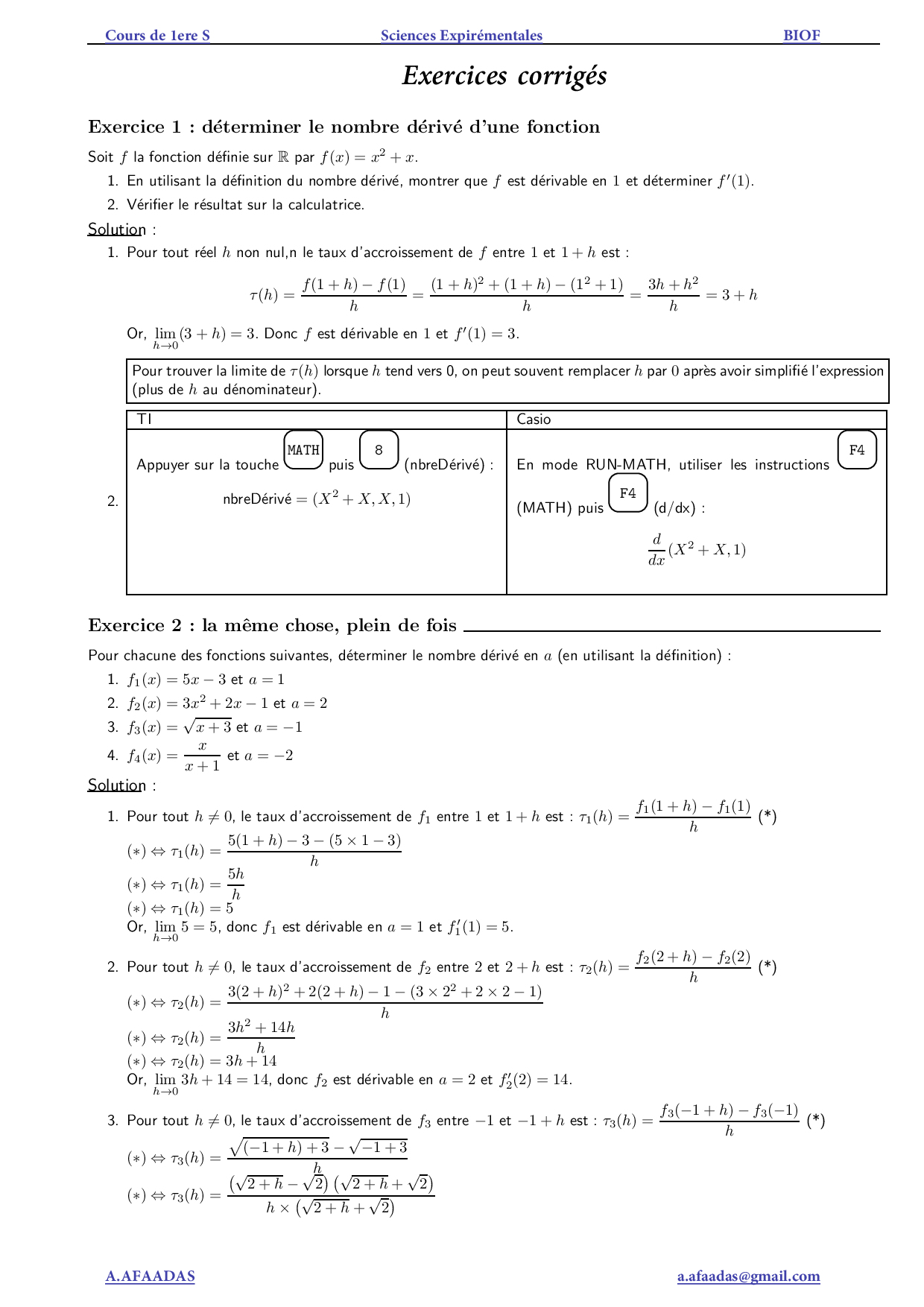 La dérivation - Exercices corrigés (FR)