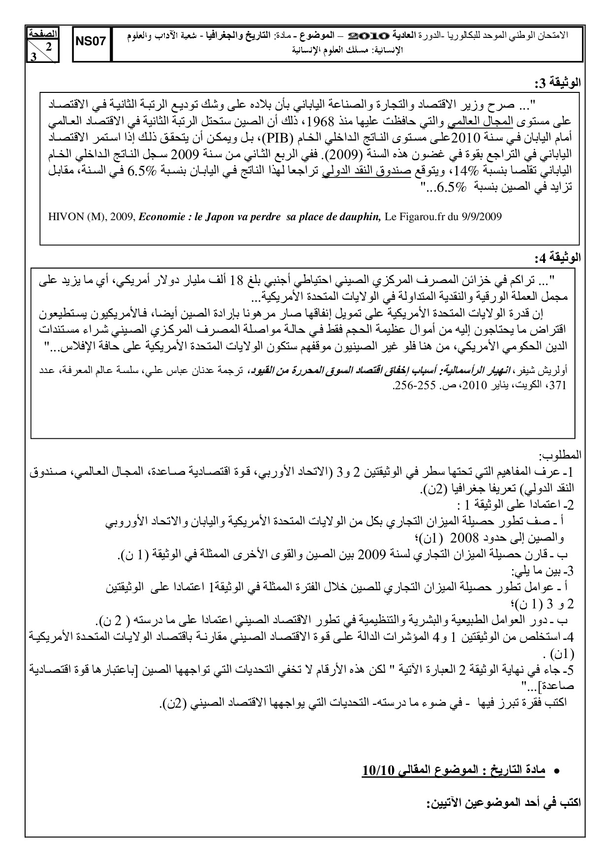 الإجتماعيات (شعبة العلوم الإنسانية) 2010 الدورة العادية - الموضوع
