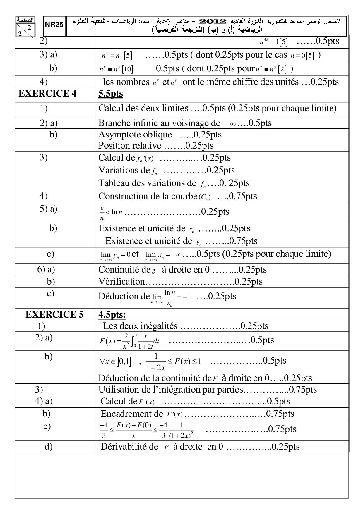 Examen National Mathématiques Sciences Maths 2012 Normale - Corrigé
