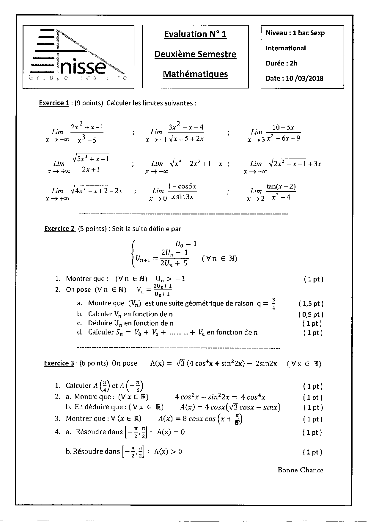 Devoir 1 Modèle 2 - Mathématiques 1er BAC Sciences Exp Semestre 2