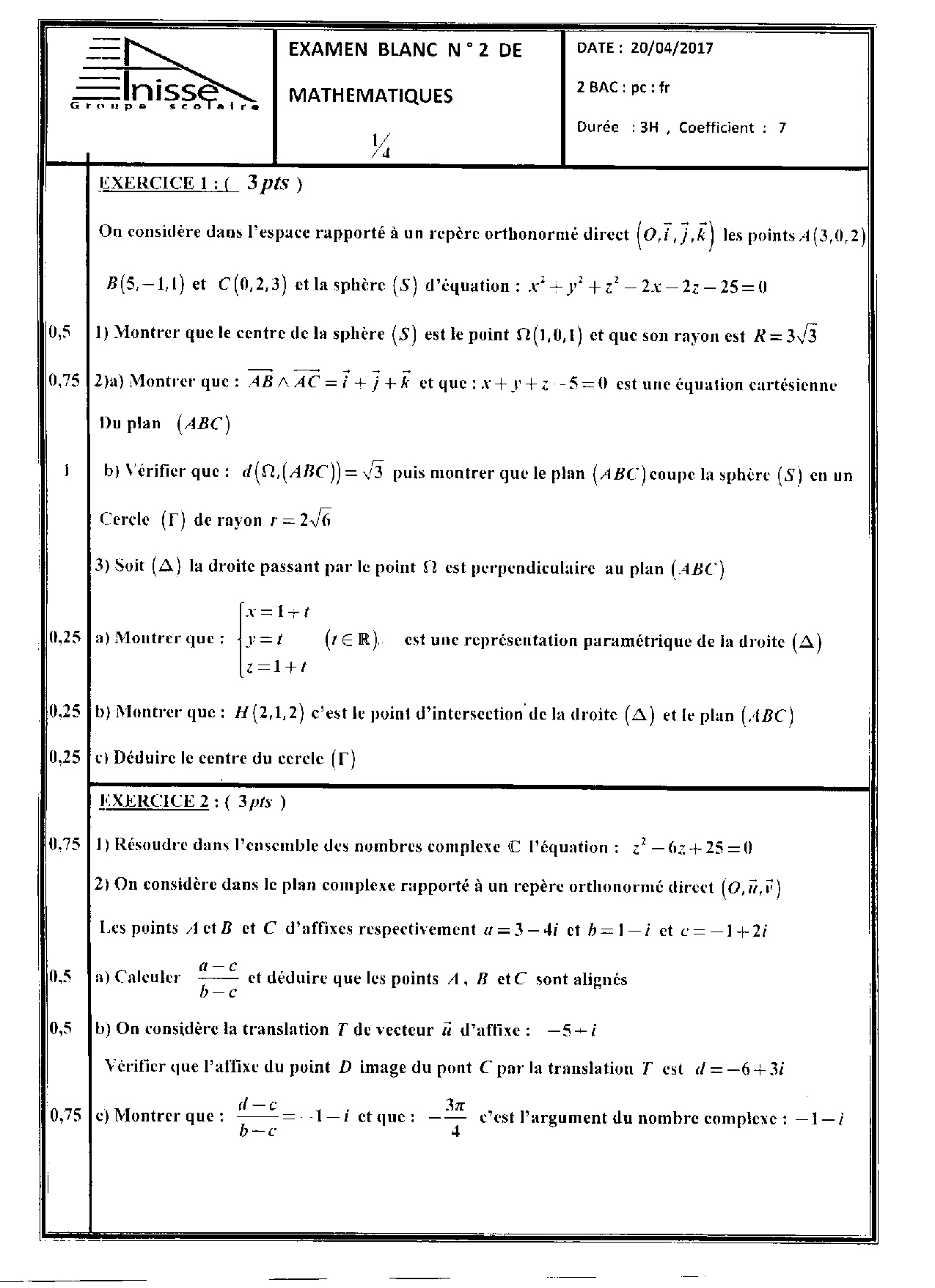 Devoir 2 Modèle 1 - Mathématiques 2 Bac SPC Semestre 2