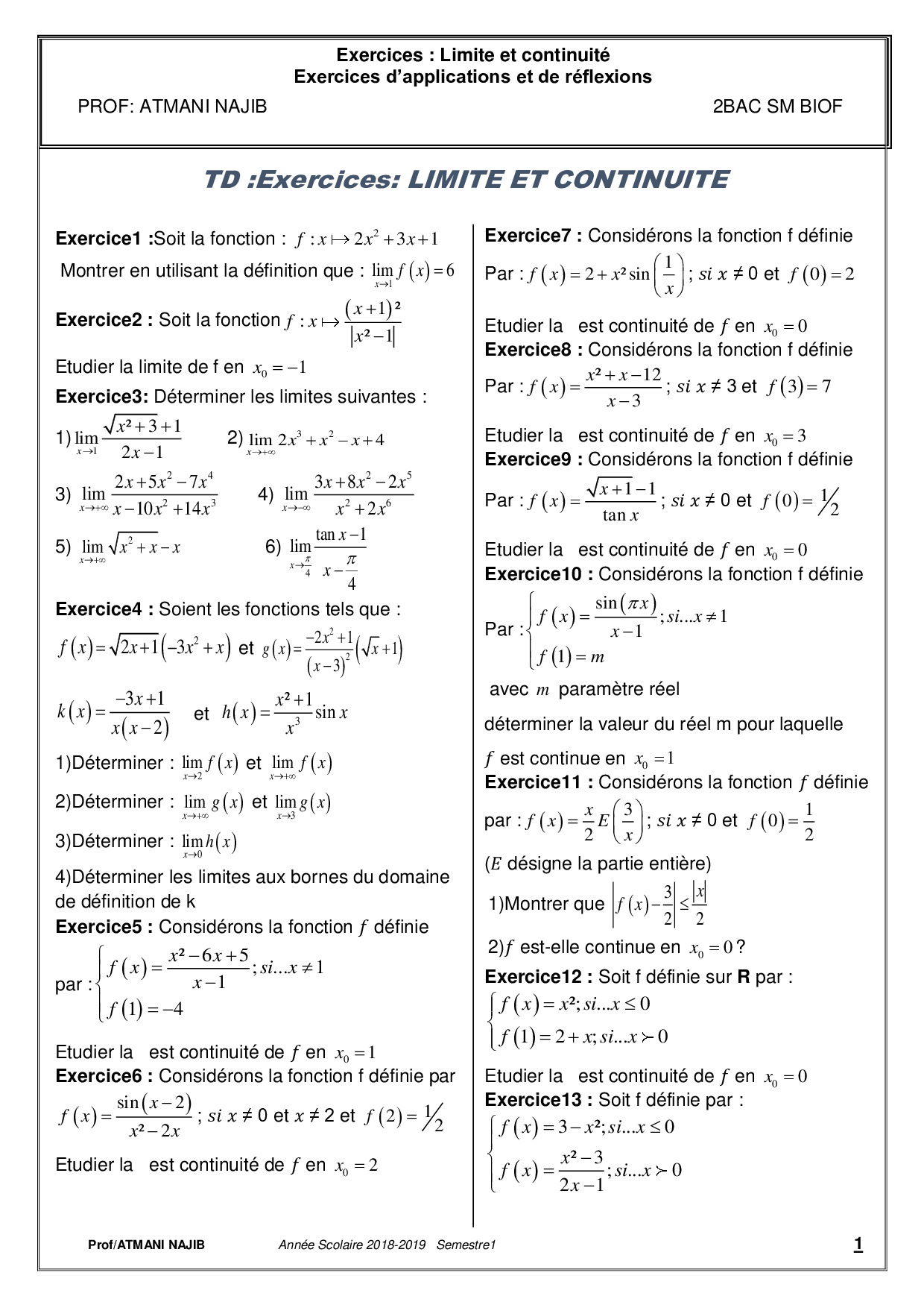 Limites et continuité - Série d'exercices 1
