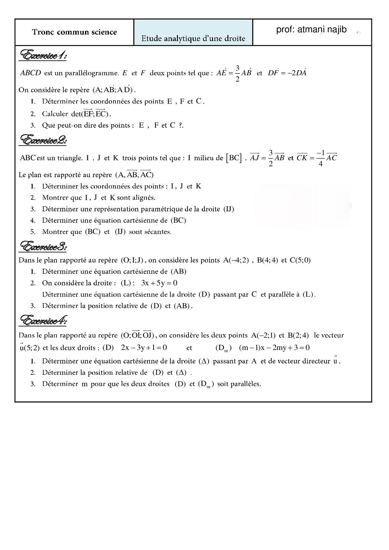 La droite dans le plan - Exercices non corrigés 1