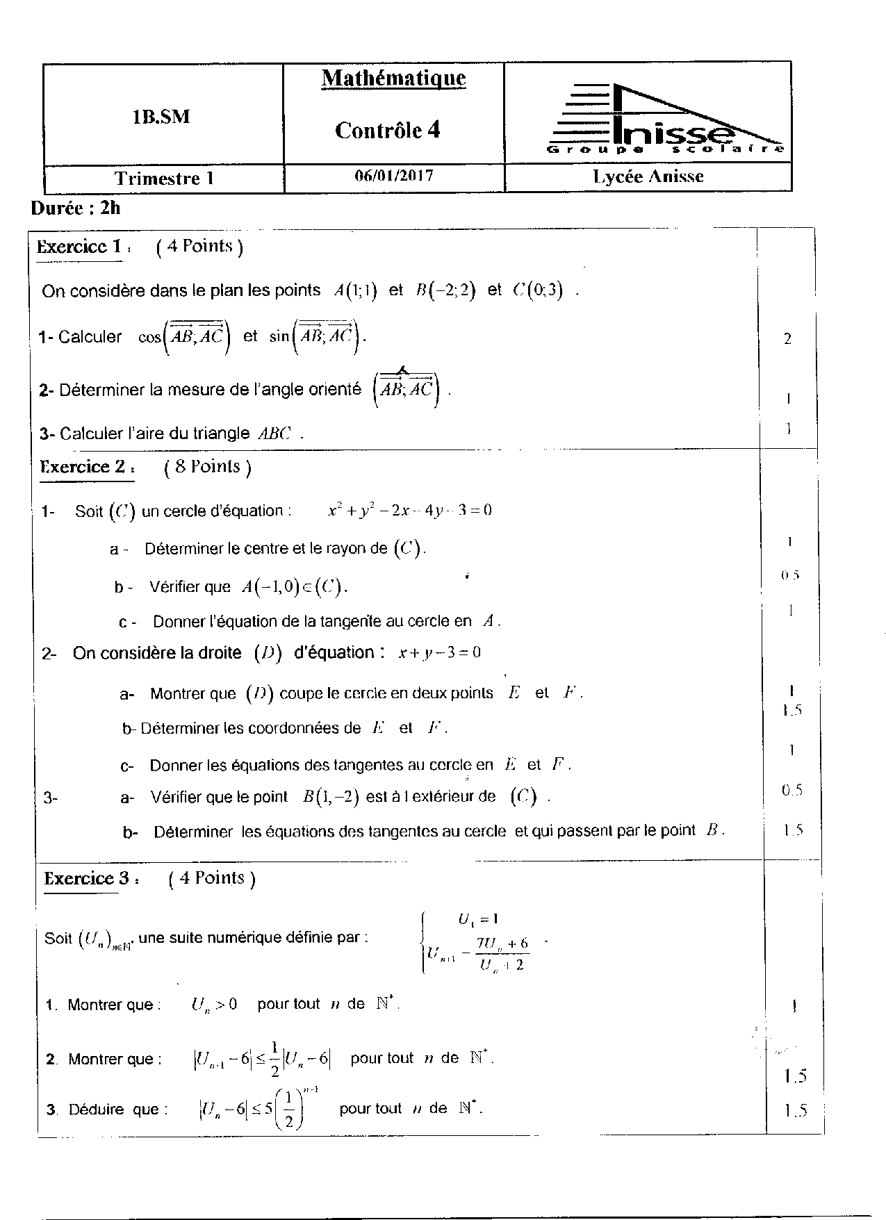 Devoir 3 Modèle 1 - Mathématiques 1 Bac SM Semestre 1