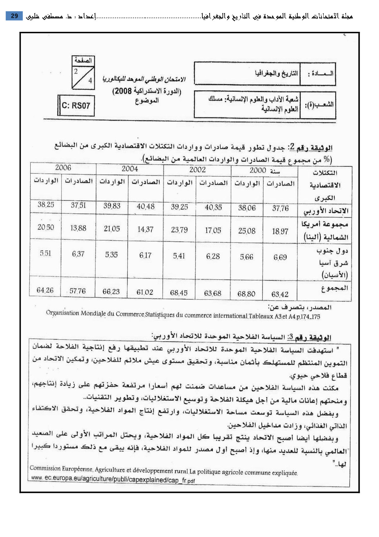الإجتماعيات (شعبة الآداب) 2008 الدورة الإستدراكية - الموضوع