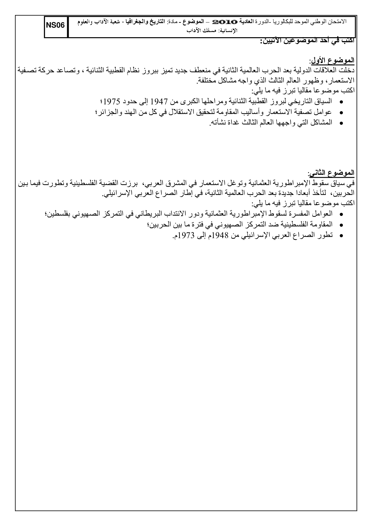 الإجتماعيات (شعبة الآداب) 2010 الدورة العادية - الموضوع