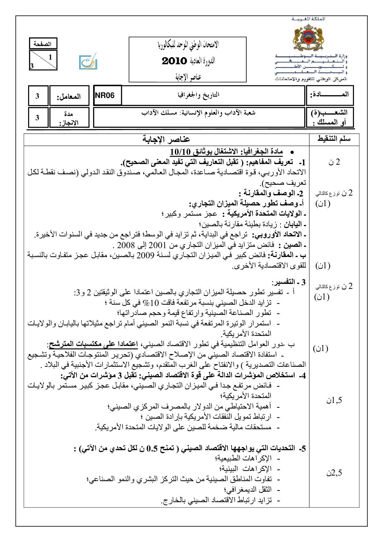 الإجتماعيات (شعبة الآداب) 2010 الدورة العادية - التصحيح