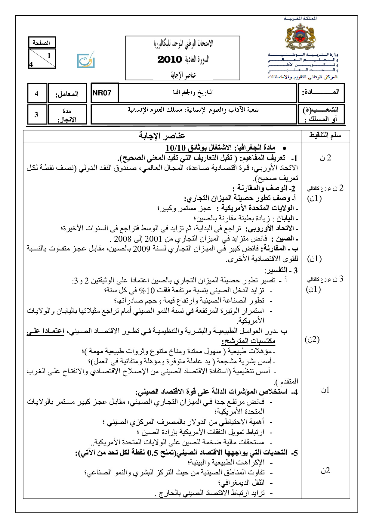 الإجتماعيات (شعبة العلوم الإنسانية) 2010 الدورة العادية - التصحيح