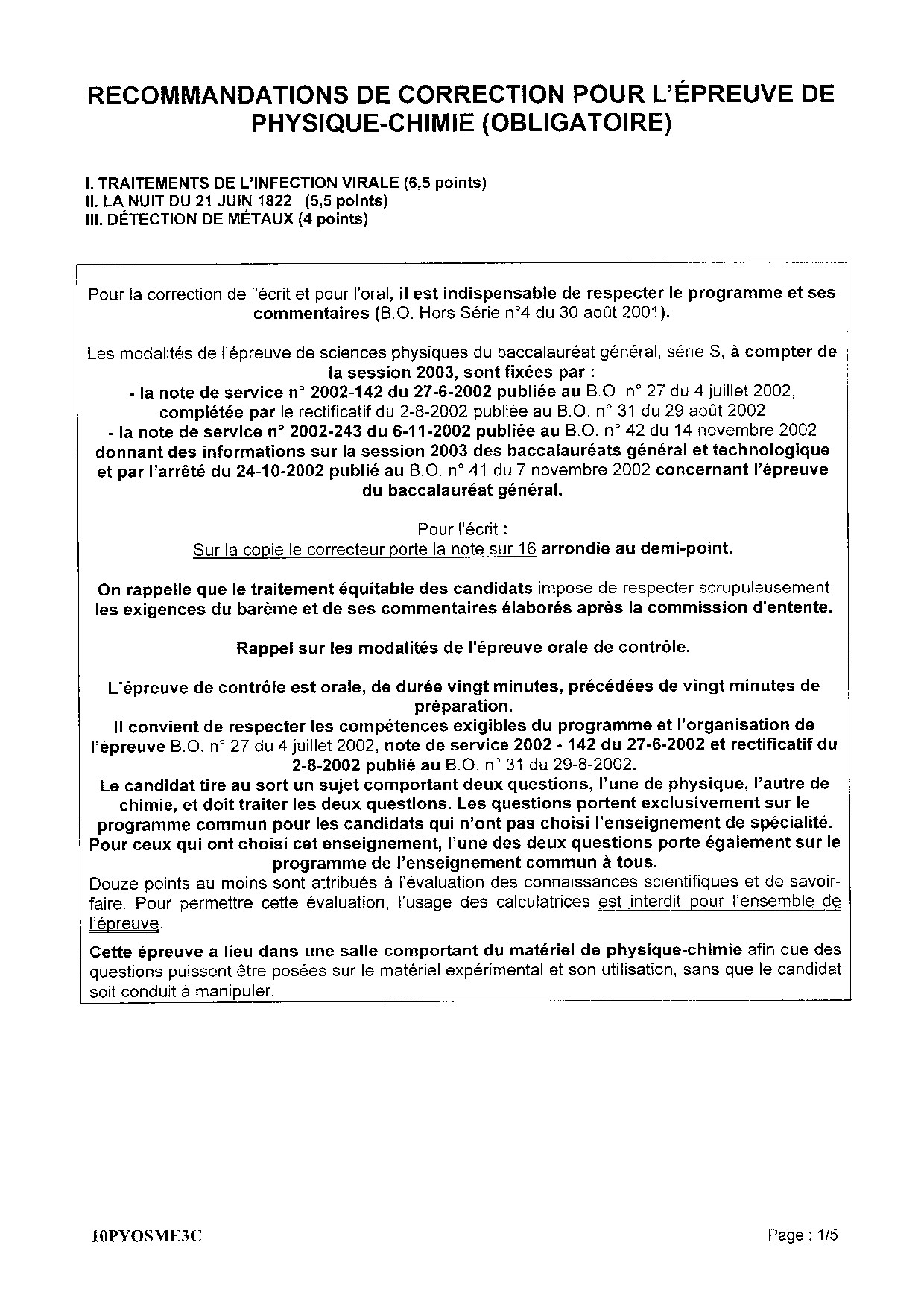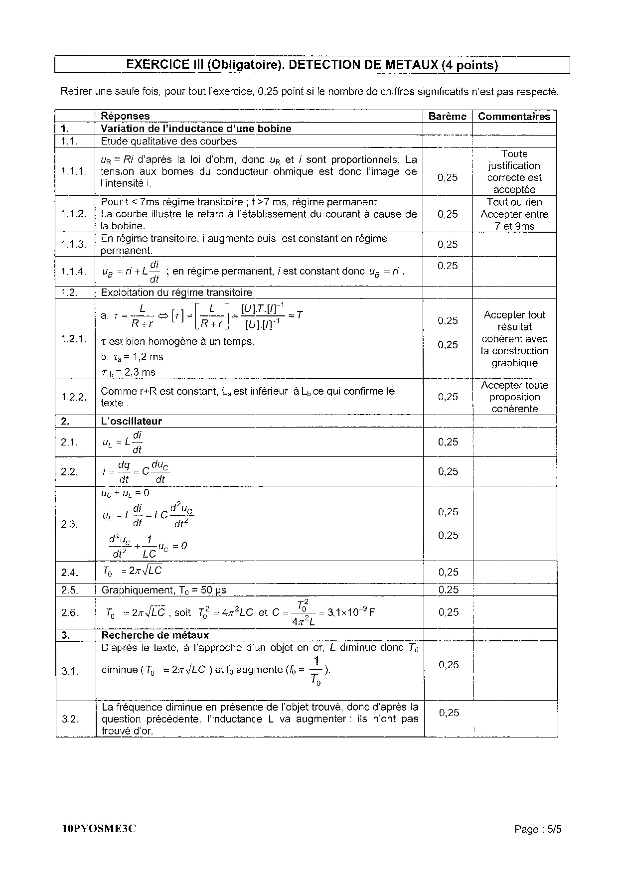 Bac S Physique Chimie Métropole 2010 (Session de remplacement) - Corrigé