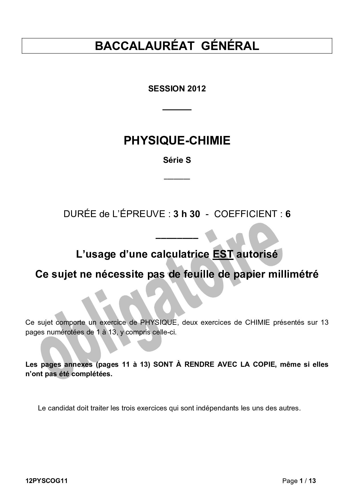 Bac S Physique Chimie Centres Etrangers Afrique 2012 - Sujet