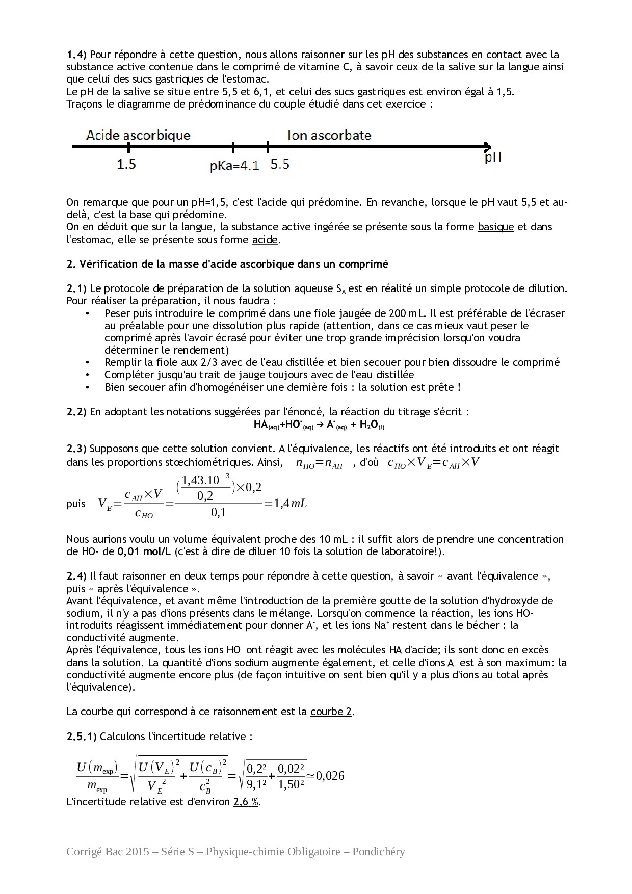 Bac S Physique Chimie Pondichéry 2015 - Corrigé