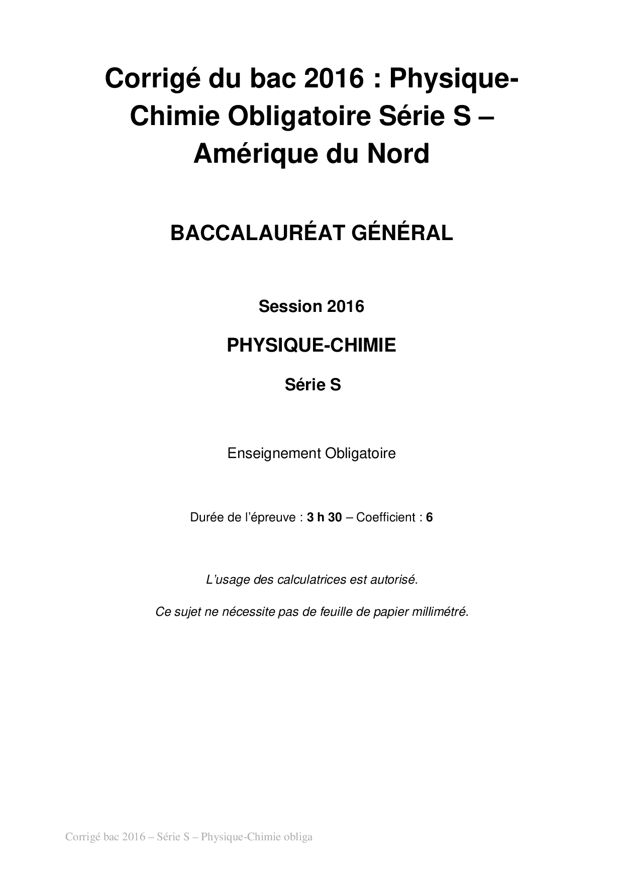 Bac S Physique Chimie Amérique du Nord 2016 - Corrigé