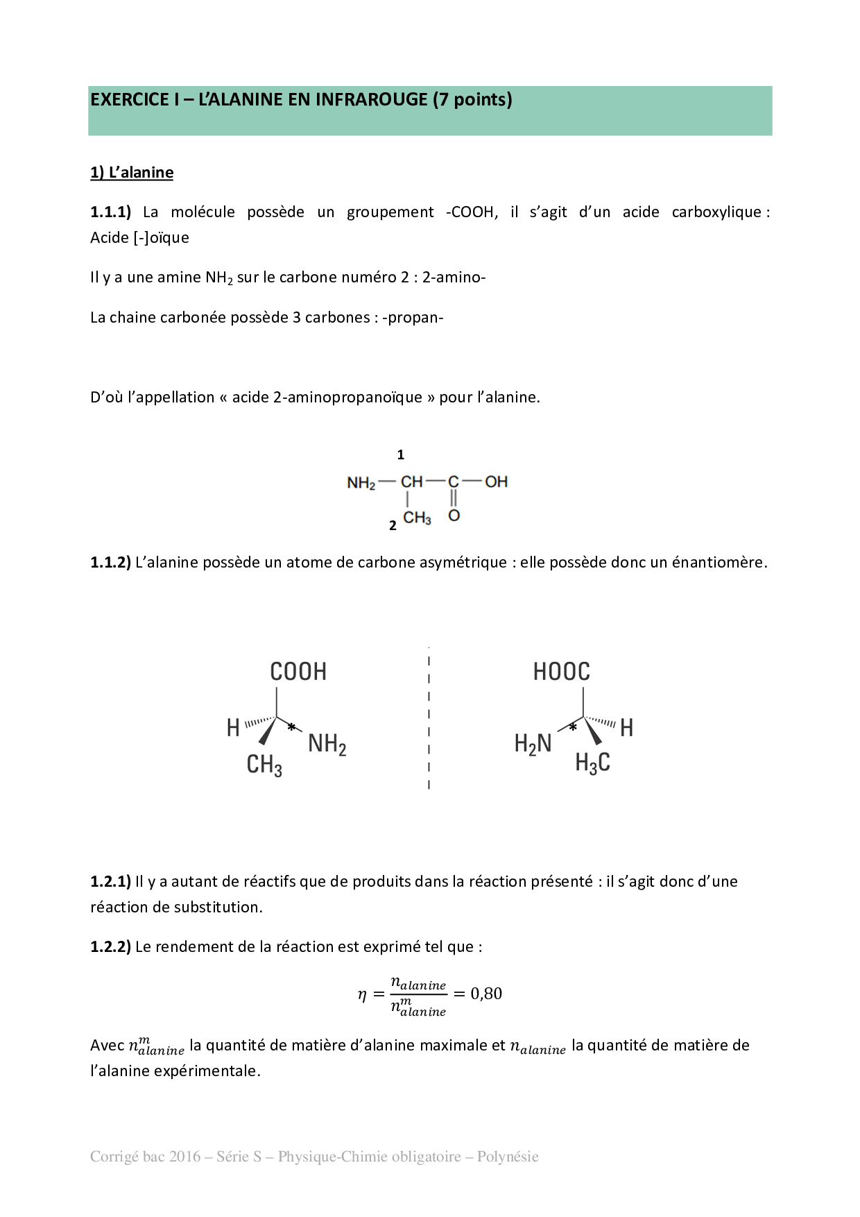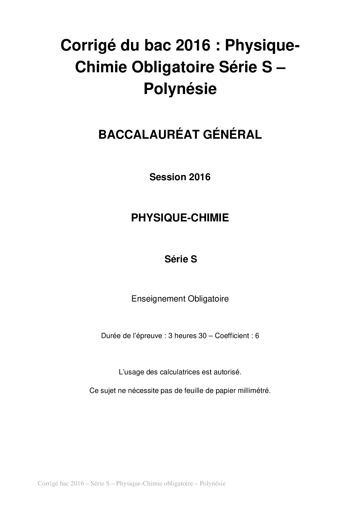Bac S Physique Chimie Polynésie 2016 - Corrigé