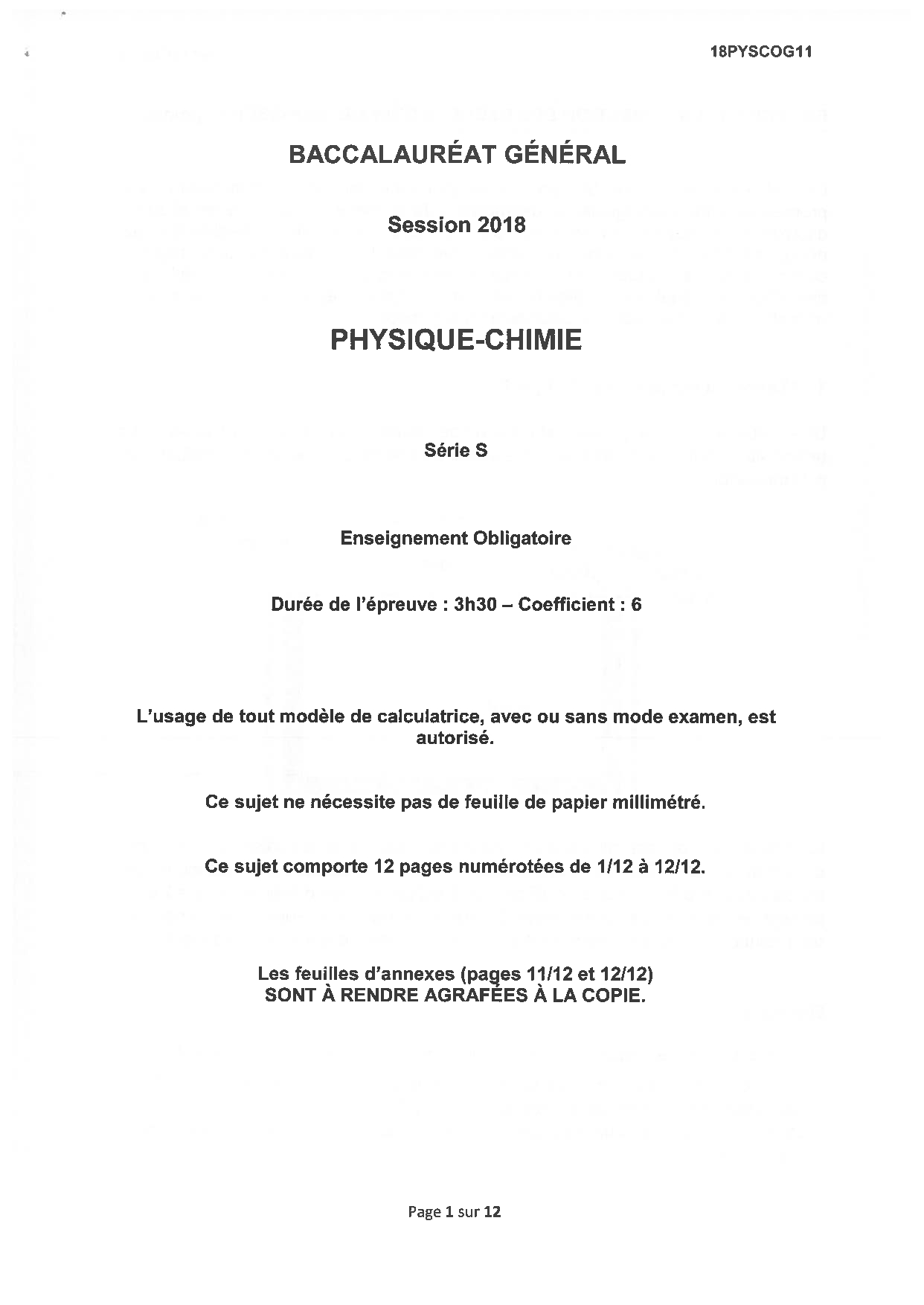 Bac S Physique Chimie Centres Etrangers Afrique 2018 - Sujet