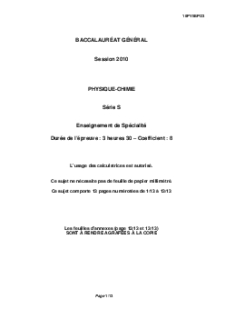 Bac S Physique Chimie (Spécialité) Polynésie (Session de remplacement) 2010 - Sujet