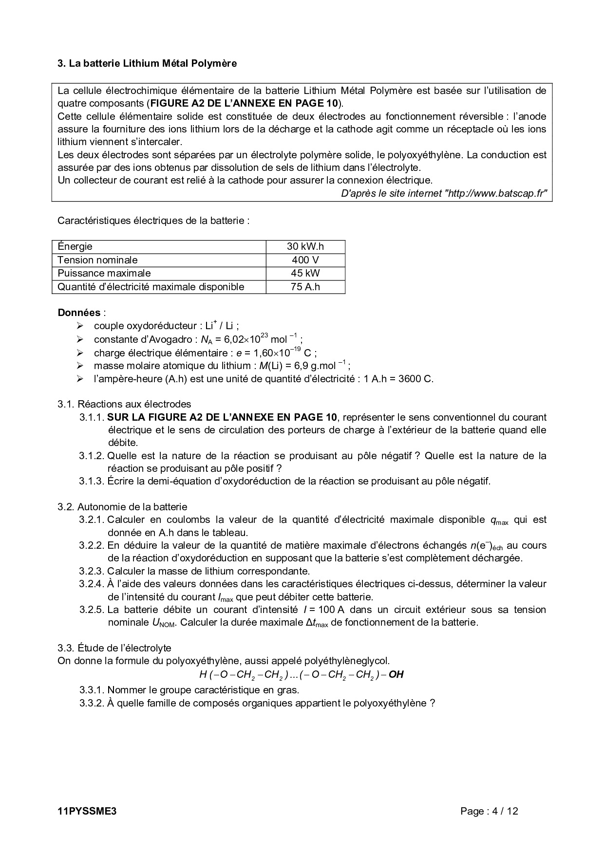 Bac S Physique Chimie (Spécialité) Métropole (Session de remplacement) 2011 - Sujet