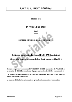 Bac S Physique Chimie (Spécialité) Métropole (Session de remplacement) 2012 - Sujet